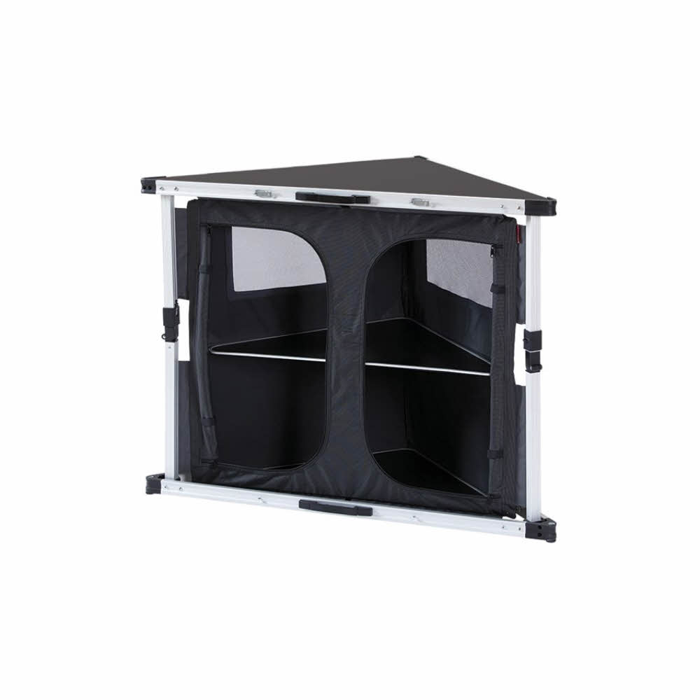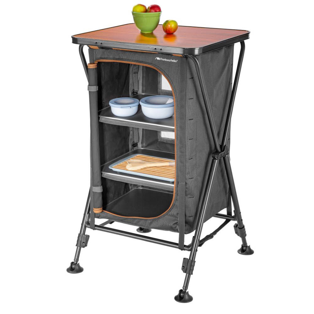 Unseren Erfahrungen nach sind klappbare Campingschränke am leichtesten und schnellsten auf- und abgebaut wie z. B. der Isabella Campingschrank.