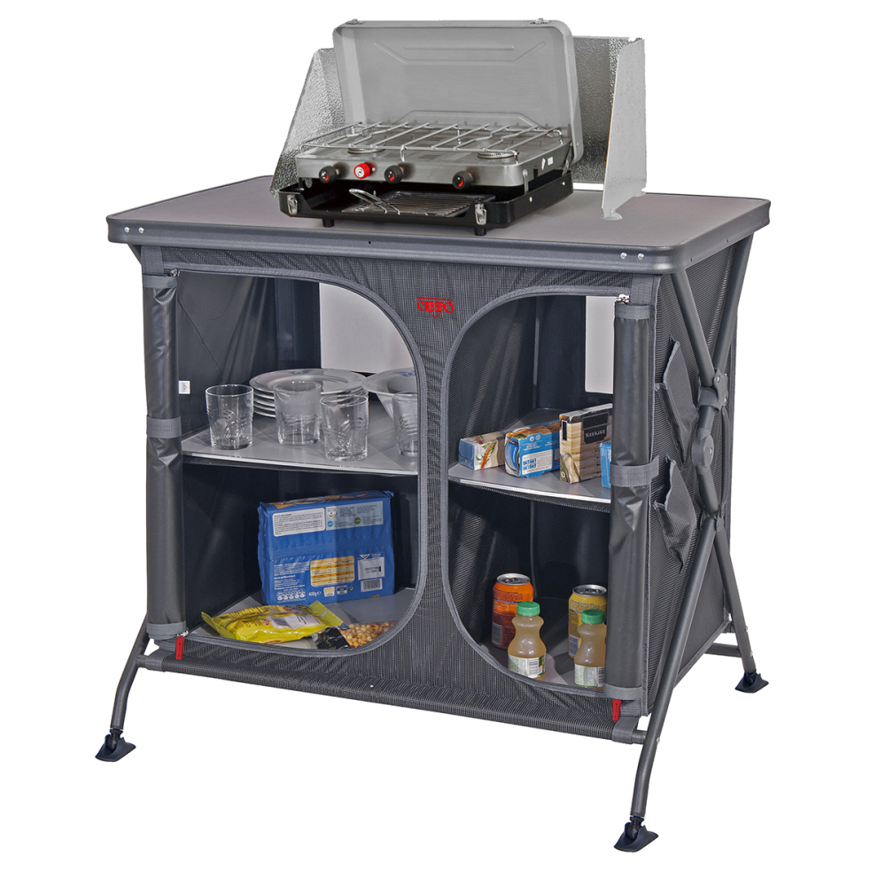 Einen Campingschrank mit einer Kochstelle erkennt man an dem mitgelieferten Windschutz für den Gaskocher. Hierfür sind in die Arbeitsplatte vorhandene Befestigungspunkte eingearbeitet, in die der Windschutz nur hineingesteckt wird. So kann dieser je nach wetterbedingter Situation verwendet oder nicht verwendet werden. Campingschränke ohne Kochstelle haben keine integrierten Befestigungspunkte, können natürlich trotzdem zum Kochen eingesetzt werden. Eine Arbeitshöhe von ca. 90 cm sollte hier jedoch im Auge behalten werden. Unterhalb der Arbeitsplatte befinden sich die Stauräume für Kochgeschirr, Spülschüssel, Essgeschirr usw. Teilweise sind die Campingschränke auch mit einer Utensilienleiste und/oder Utensilientasche für Ihr Koch- und Back-Werkzeug ausgestattet, um alles griffbereit zu haben. Die Türen können mithilfe von Reißverschlüssen auf- und zugemacht werden. Im offenen Zustand sind die Türen aufrollbar und mit einem Klettverschluss zu befestigen. Eine integrierte Belüftung in der Rückwand sorgt für eine ausreichende Luftzirkulation bei geschlossenen Türen.