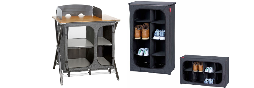Die Campingschränke zeichnen sich mit innovativem Faltsystem für den leichten Auf- und Abbau im Handumdrehen aus. Egal ob Kleiderschränke oder Küchenschränke – sie bieten viel Platz für Kleidungsstücke, Schuhe, Utensilien, Koch- und Essgeschirr sowie Küchenhelfer und benötigen wenig Stauraum durch ihr geringes Packmaß. Vor Staub und Schmutz schützen die eingearbeiteten Reißverschlüsse an den Türen, die auch aufgerollt und mithilfe Schlaufen befestigt werden können. Die meisten Schränke verfügen über eingenähte Fliegengazen in der Rückwand zur Entlüftung und mindestens einem verstellbaren Fuß, der unebene Flächen ausgleicht. Die mitgelieferten Einlegeböden sorgen für eine sichere Aufbewahrung Ihrer Utensilien.