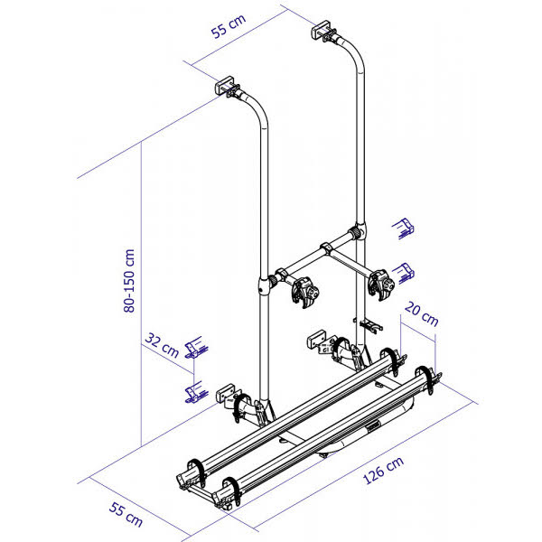 Kompakter Fahrradträger, der eine Tragkraft von max. 35 kg (je Schiene max. 19 kg) hat. Die Montage ist auf der rechten oder linken Hecktüre möglich. Die Fahrrad-Schienen können versetzt montiert werden, so dass die Fahrräder in der Mitte der Heckwand fixiert sind.