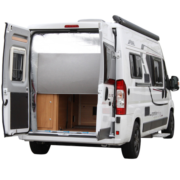 Er wird entlang der Oberkante mit Druckknöpfe montiert und erhöht so den Wohnkomfort im Van durch effiziente Wärmeisolierung. Die aus aluminisierter Polyesterfolie bestehende Außenseite ist feuchtigkeitsabweisend, so dass die Hecktür auch bei Nässe oder Schnee problemlos geöffnet werden kann. Der Vorhang lässt sich mit 2 Reißverschlüssen öffnen, so dass der Stauraum unterhalb des Bettes oder auch der Gasflaschenschrank bequem von außen erreichbar bleiben.