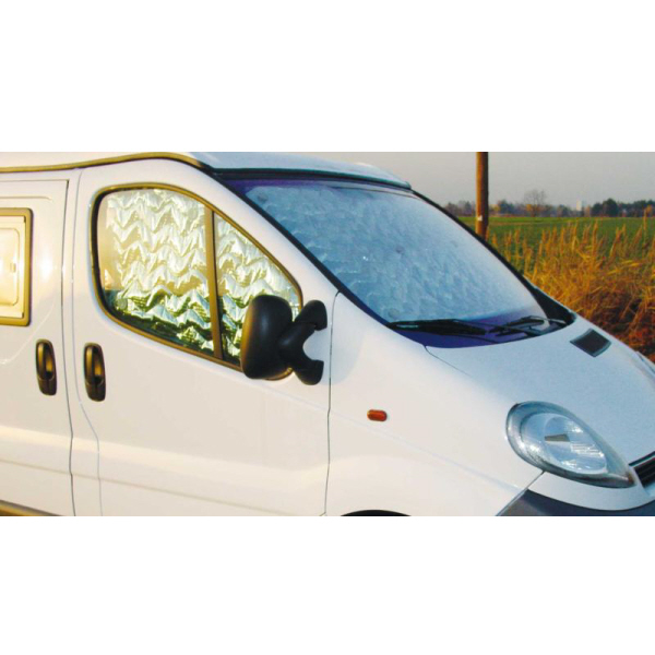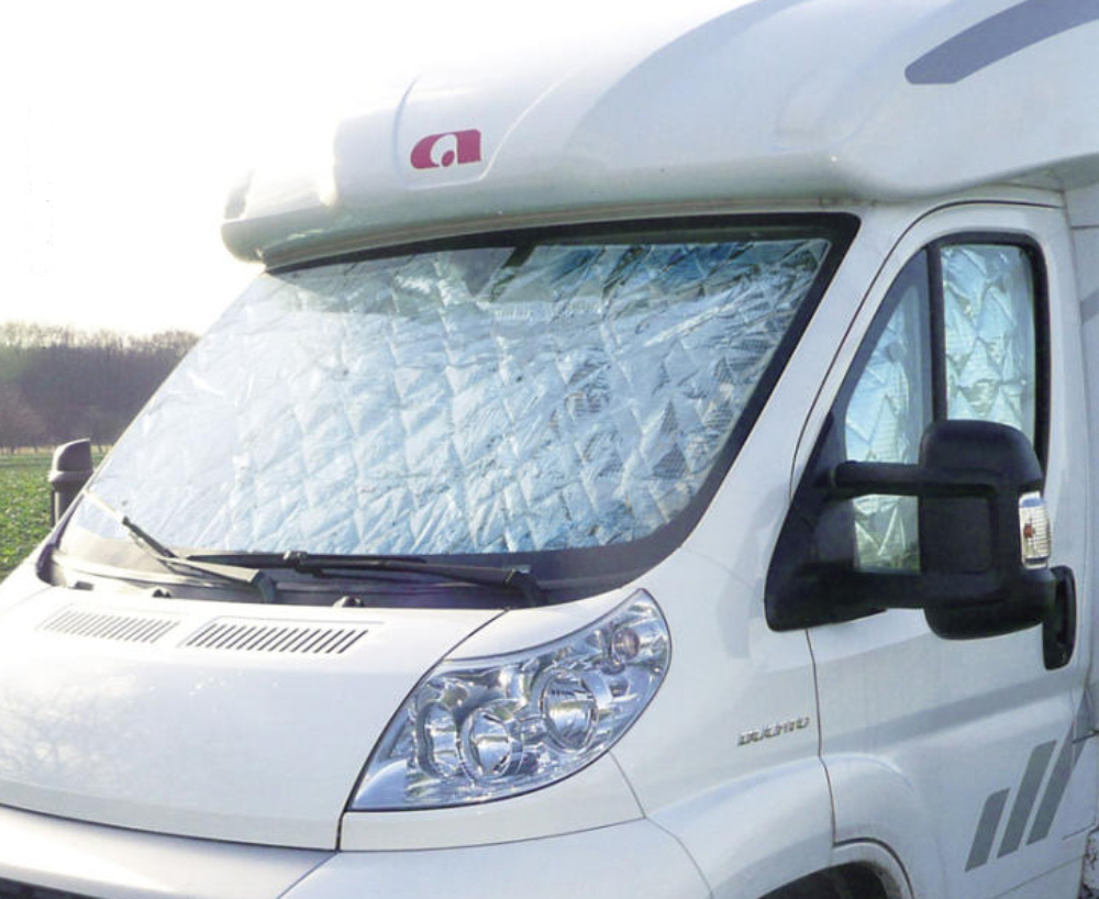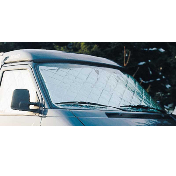 Die grauen Thermomatten bestehen aus 9-lagigem Isoflex-Material. Sie reflektieren die Sonneneinstrahlung, isolieren gegen Wärme, Kälte und dienen zugleich als Sichtschutz. Eine einfache Montage erfolgt durch die mitgelieferten Saugnäpfe.