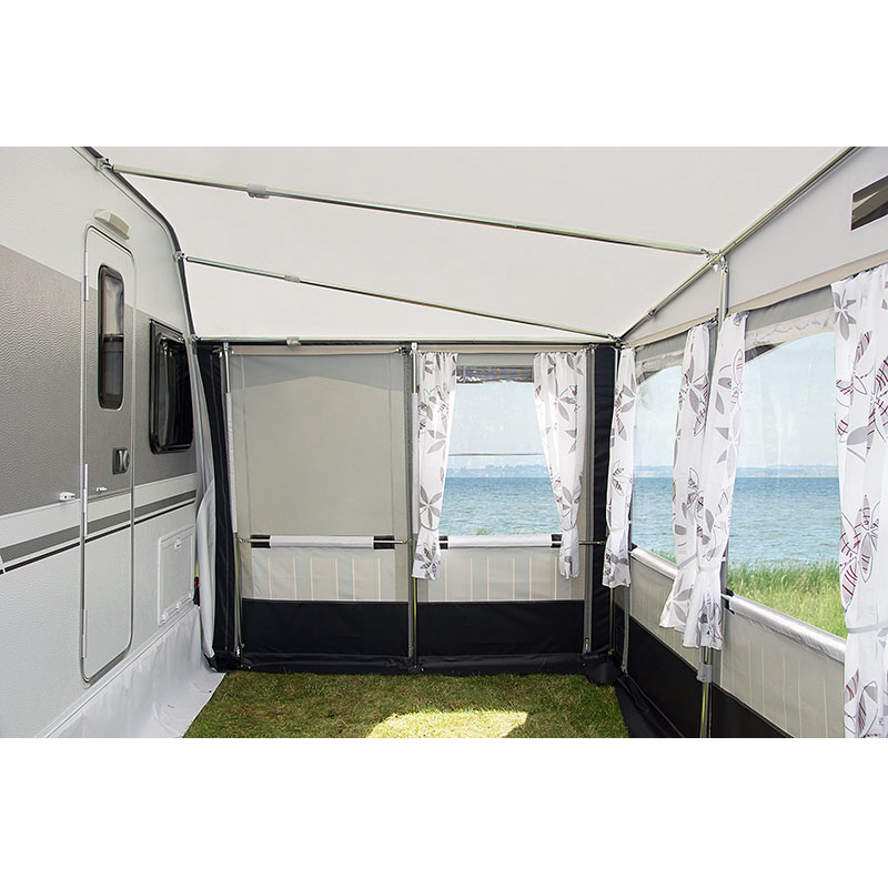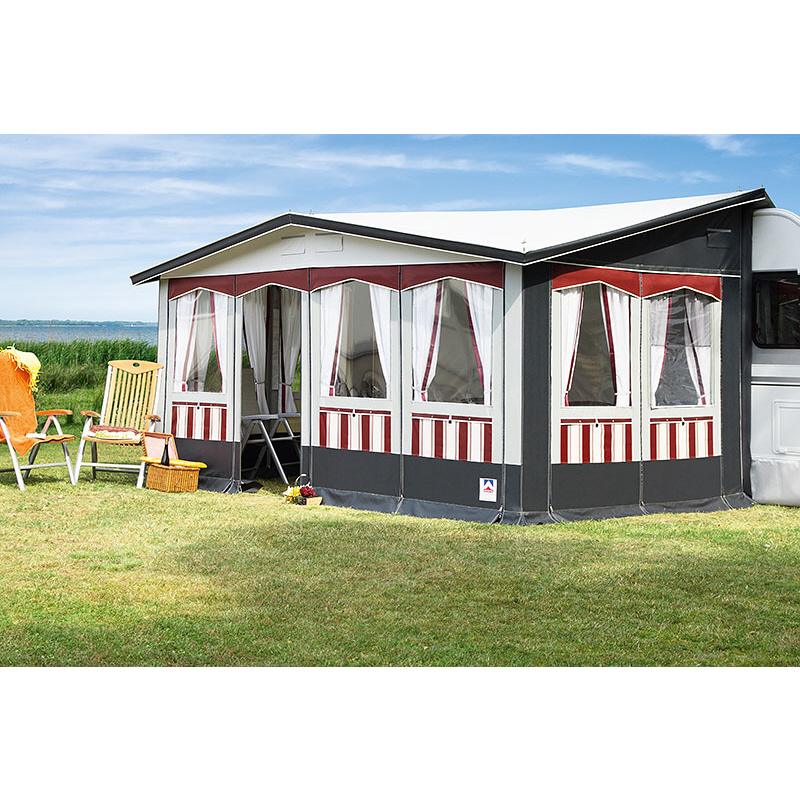 Lieferumfang: Vorzelt, Gestänge, Schürze, Gardinen, Abspannmaterial, Packsäcke, Radkastenabdeckung, Deichselhaube, Rückwand und Schaumstoffpolster.