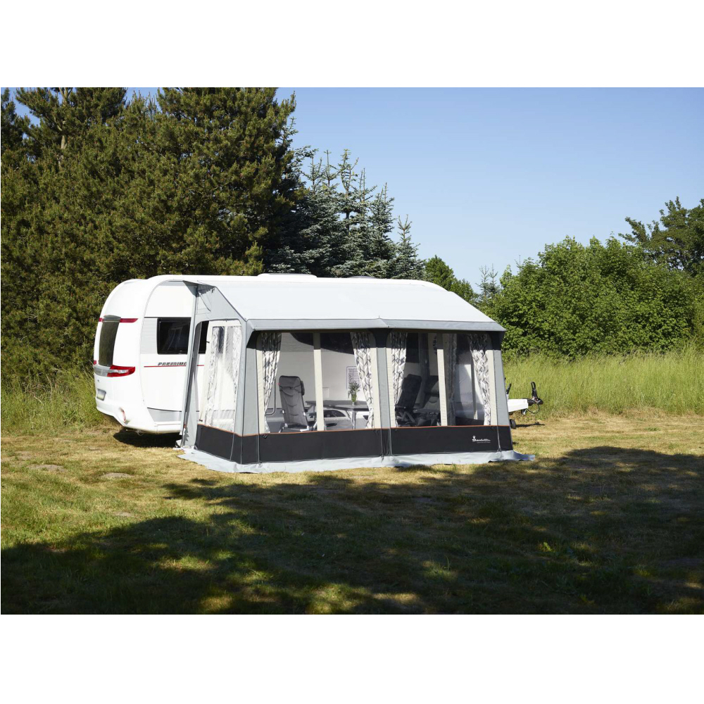 Beim Universal Dawn 360 wurde vor allem auf Stabilität und Funktionalität geachtet. Die spezielle Dachkonstruktion mit Mittelkreuzen und Querstangen, verleihen diesem Modell eine hohe Belastbarkeit. Durch eine zusätzliche Wintersicherung kann diese sogar noch erhöht werden. Die beiden mitgelieferten gebogenen Stützstangen drücken die fest angenähten Schaumstoffkissen an den Wohnwagen und sorgen für einen perfekten Anschluss. Für ein gutes Raumklima sorgt das Isacryl-Gewebe, welches atmungsaktiv und robust zugleich ist.