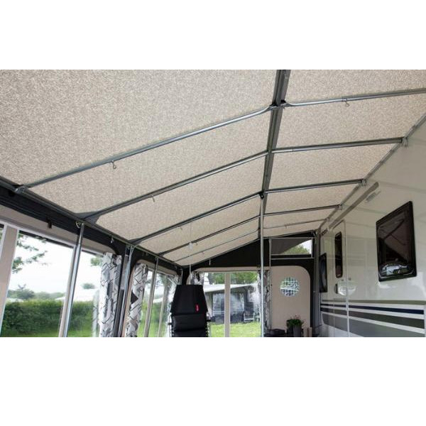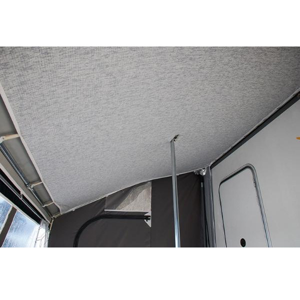 Details: besonders breiter, außenliegender Faulstreifen, spezielle Dachneigung, äußerst belastbare Fensterfolie, spezieller Anschluss seitlich am Wohnwagen.