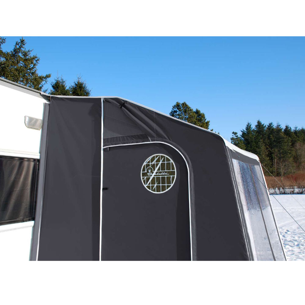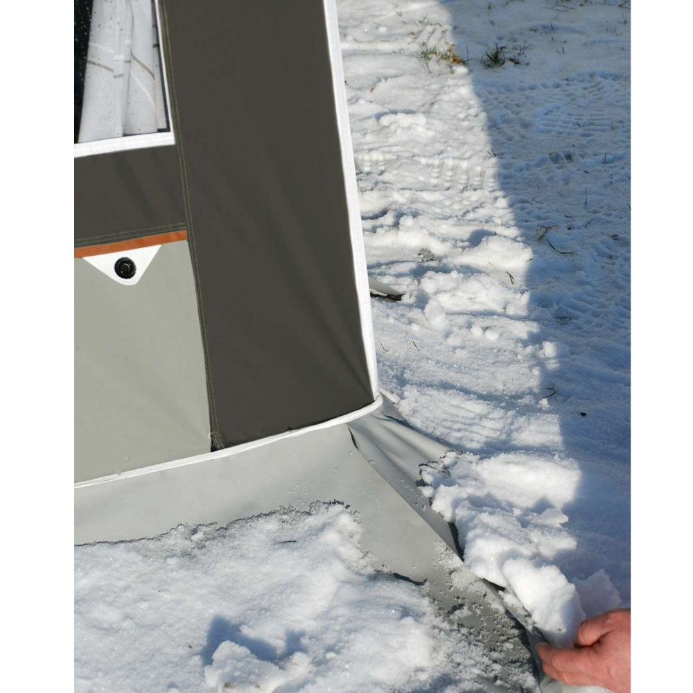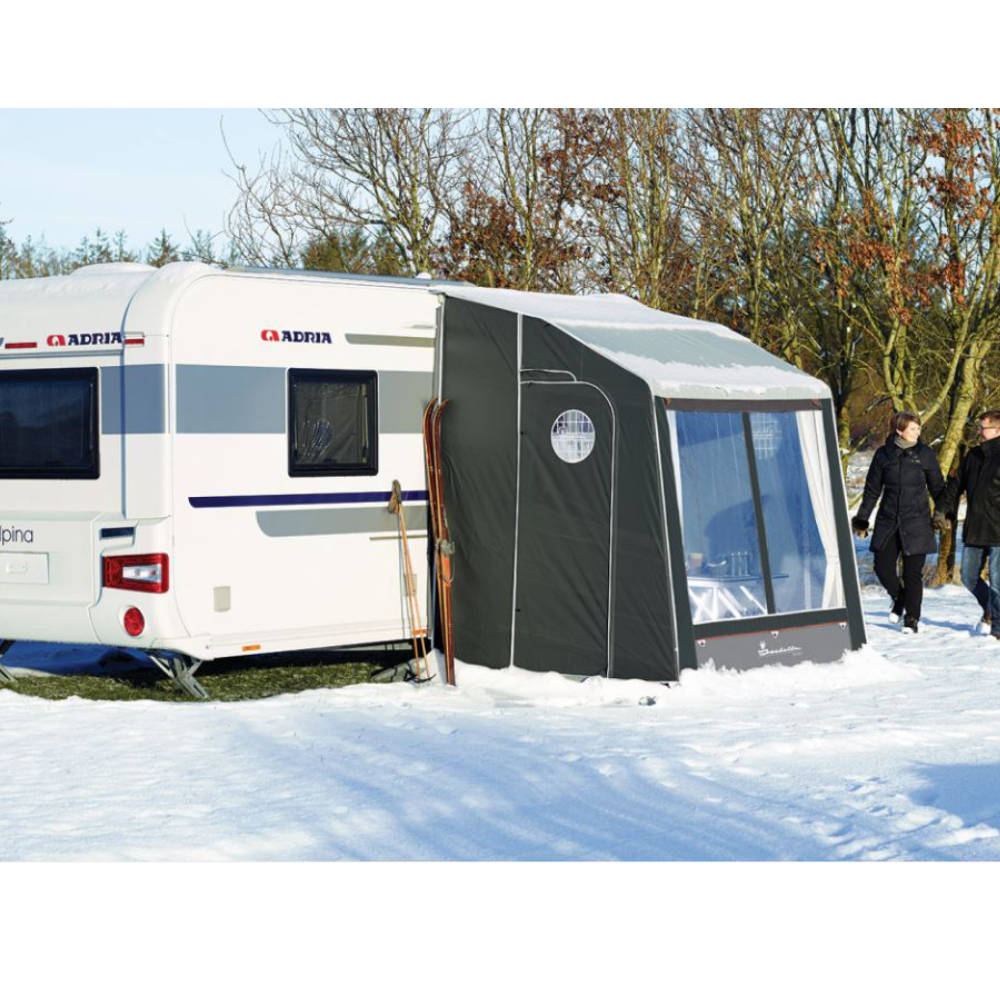 Die stabile Dachkonstruktion mit der speziellen Neigung lässt bei unserem Wintervorzelt Wasser und Schnee besser abrutschen. Eine kältestabile Fensterfolie, der besonders breite außenliegende Faulstreifen und der gute Anschluss am Wohnwagen mit fest angenähten Polstern, gebogener Stützstange und speziellen Verbindungsprofilen sind Qualitätsmerkmale, die das Winter auszeichnen. In beiden Seitenwänden befinden sich Türen, die von unten und von oben (bei Schnee vor der Tür) geöffnet werden können. Die Hochentlüftungen in beiden Seitenwänden sind per Reißverschluß verschließbar.