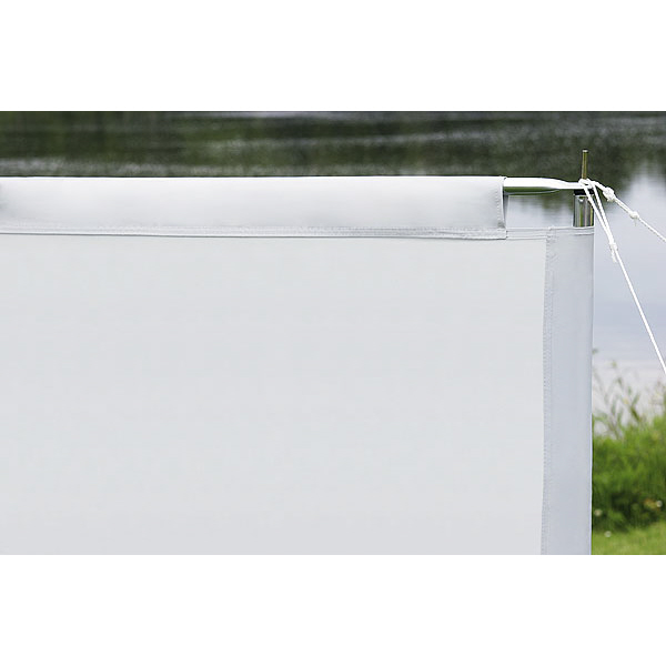 Ausführung: Die Außenstangen werden durch feste Hohlsäume geführt, die 2 inneren Stäbe mit Klettbändern am Gewebe befestigt. Die waagerechten Spannstäbe werden durch Hohlsäume geführt und verleihen dem Windschutz Stabilität.