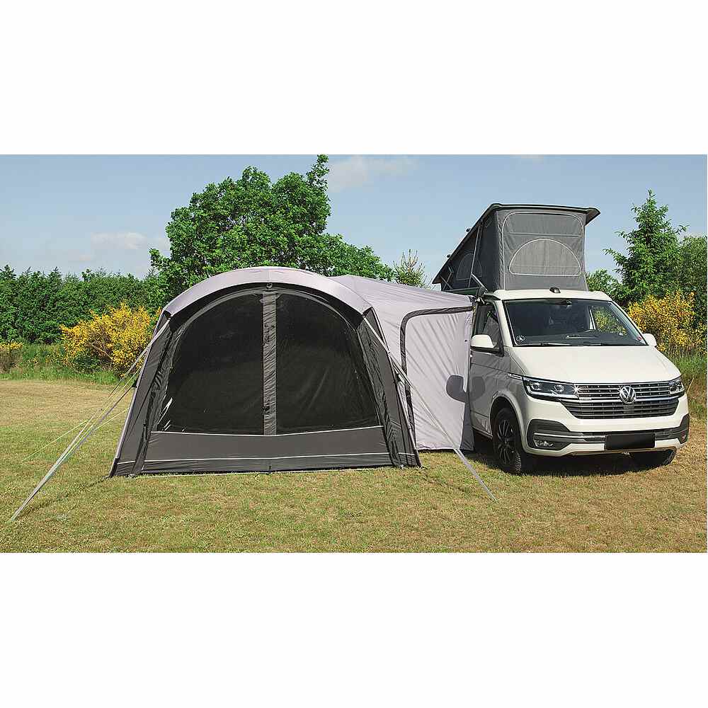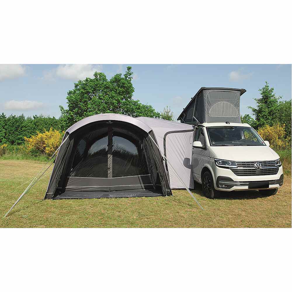 Das aufblasbare Busvorzelt Jonesville 440SA wird parallel zum Fahrzeug aufgestellt, sodass die Stellfläche ideal ausgenutzt wird. Es bietet mit seiner variablen einsetzbaren Vorderfront eine flexible Raumaufteilung und somit kann der Innenraum den Gegebenheiten angepasst werden. Die auszippbare Front kann um ein Element versetzt werden: Maximal großer Innenraum oder kleiner innen, dafür aber ein überdachten Frontbereich. Im Lieferumfang ist eine hochgezogene Bodenplane, sollte die Front ganz nach vorne gesetzt werden. Die bewegliche Vordertür, sowie die beide Seitentüren im Wohnraum sind mit einer zusätzlichen Moskitonetztür versehen, welche für eine gute Belüftung sorgen.