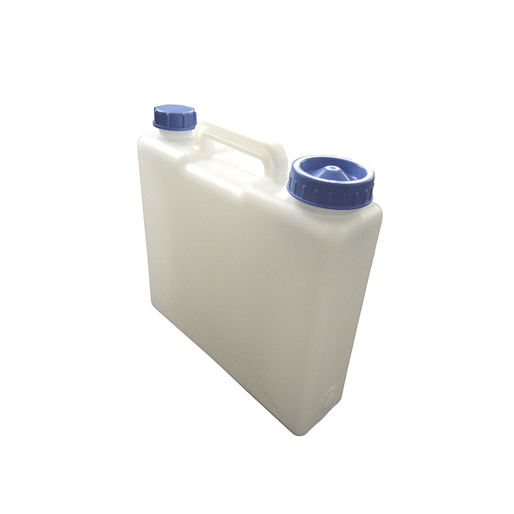 Extra flacher Kanister mit zwei Öffnungen (DIN 96/61) aus Trinkwasser zugelassenem Polyethylen.