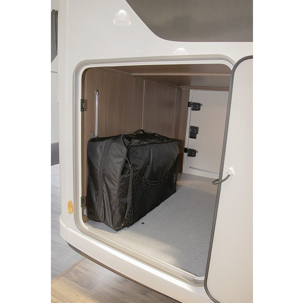 Die Tasche ist so konzipiert, dass sie nach ihrer Wahl auf der rechten oder linken Fahrzeugseite montiert und bequem genutzt werden kann. Für ein bequemes Handling sind die Reißverschlüsse so angeordnet, dass die Möbel nur hineingeschoben bzw. herausgezogen werden. So sind sie über Nacht oder für die Weiterreise im Fahrzeug schnell und sicher an ihrem Stammplatz untergebracht. Mit dem Tragegriff lassen sich alle Campingmöbel gemeinsam transportieren und einlagern.