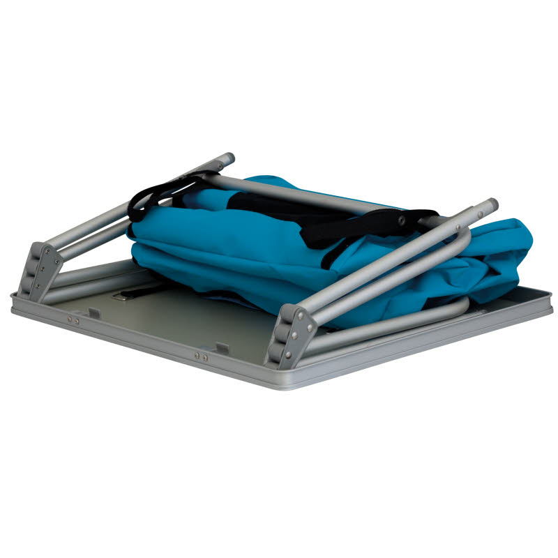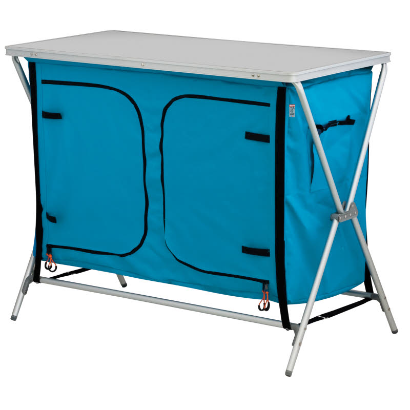 Mit dem Polyesterbezug in Azurblau bringt dieser Faltschrank einen neuen frischen Farbakzent in Ihr (Vor-)Zelt. Die Montage ist denkbar einfach, denn der Bezug ist mit dem außenliegenden Aluminiumgestänge verbunden - einfach auseinanderklappen und der Schrank steht praktisch schon. Es müssen nur noch die Tischplatte aufgeklipst und die Regalböden eingelegt werden - fertig!