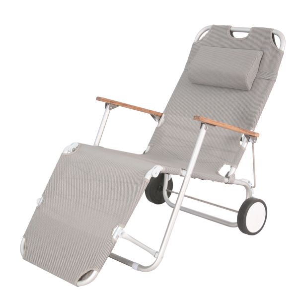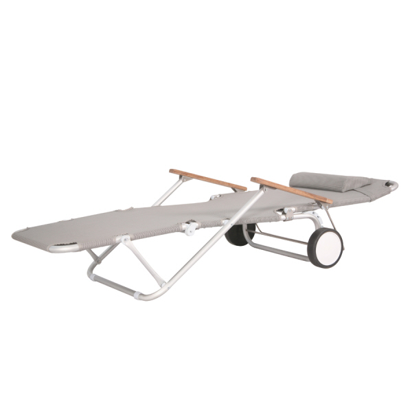 Universell einsetzbare Strandliege mit Transportmöglichkeit, die durch ihr leichtes Aluminiumgestell mit wetterfester Textilenbespannung, Armlehnen aus Bambus und einfacher Verstellmöglichkeit die verschiedenen Nutzungsmöglichkeiten in einem Produkt vereint. Zusätzlich verfügt sie über rostfreie Edelstahlbeschläge.