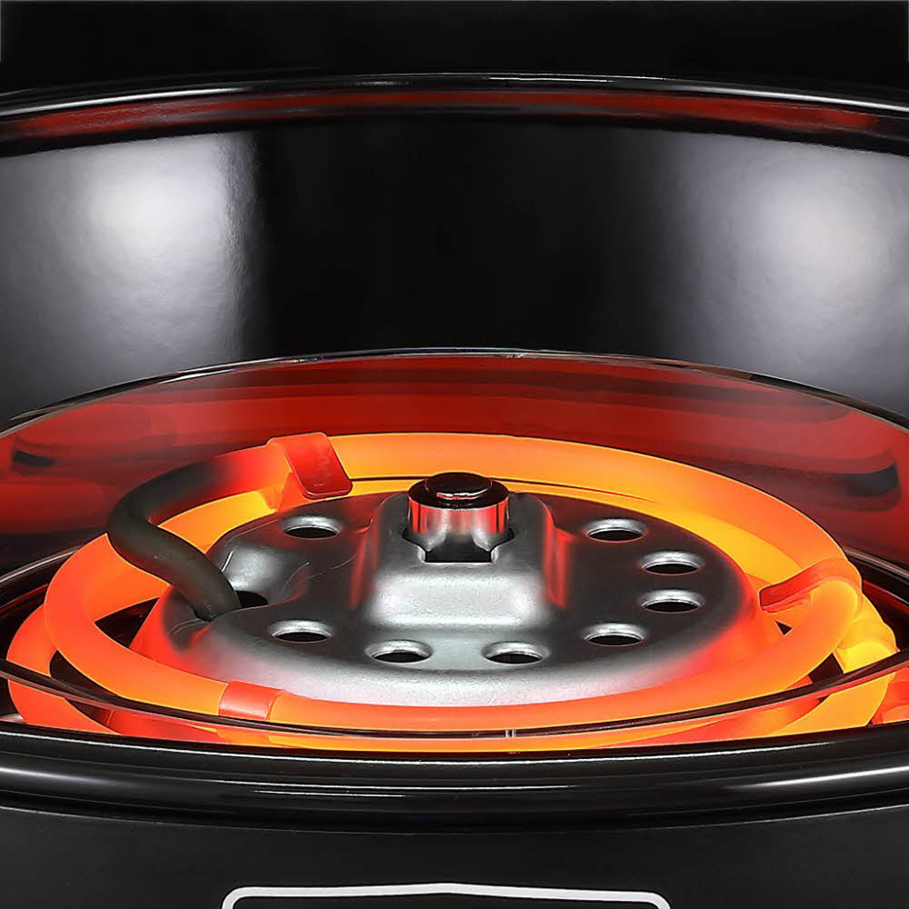 Der E-Braai ist ein elektrischer Grill mit präziser Temperatureinstellung. Die 2,3 kW-Heizspirale sorgt für eine schnelle Aufwärmzeit. Ein abnehmbarer Glasring schützt die Spirale vor abtropfendem Fett. Dank der einzigartigen Spot-on-Grilling-Technology wird die Temperatur direkt am Grillrost gemessen (statt unter dem Deckel). Die gewünschte Temperatur kann auf dem digitalen Display exakt eingestellt und konstant gehalten werden. Die Temperatur des E-Braai ist stufenlos von 70 bis 270 Grad regelbar, sodass er auch für langsames Garen geeignet ist. Die abnehmbare Fettwanne ist spülmaschienenfest und leicht zu reinigen. Der Deckel enthält 4 Lüftungslöcher für gute Luftzirkulation und gleichmäßige Wärmeverteilung.