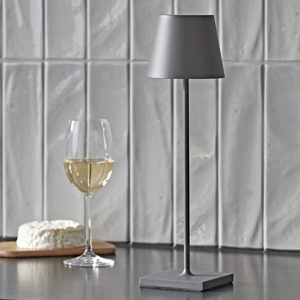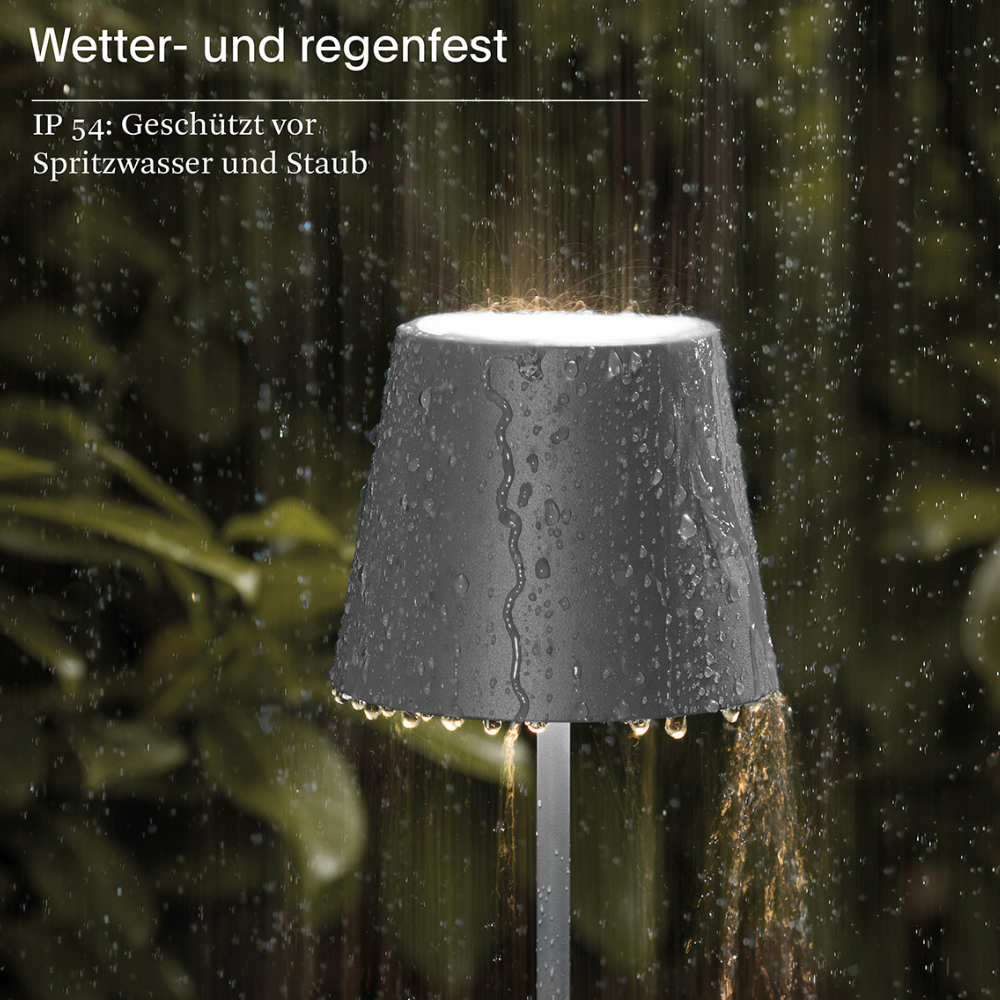 Innen und Außen: Die dimmbare Akku-Tischleuchte für den Wohn- und Außenbereich hält dank Schutzklasse IP54 (spritzwassergeschützt) auch Regenschauer aus.