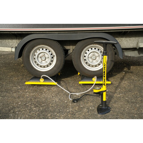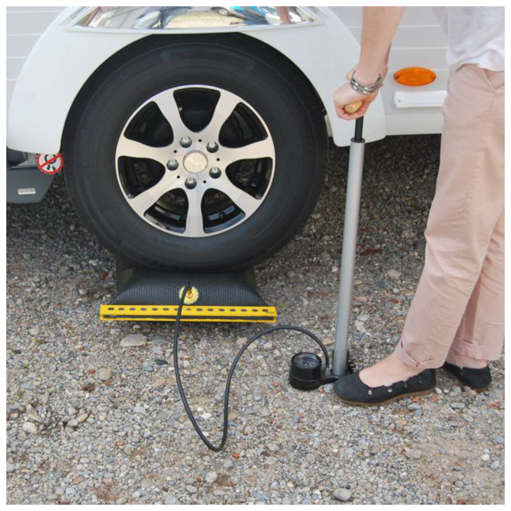 Der EMUK Air-Lift ist ein hochbelastbares Druckluft-Hebekissen, welches speziell für Campingfahrzeuge entwickelt wurde. Alle Höhenunterschiede können stufenlos von 1,5 cm bis 20 cm ausgeglichen werden. Die Tragkraft des EMUK Air-Lift beträgt 11 Tonnen. Die Handhabung ist sehr einfach. Das Kissen wird einfach unter dem jeweiligen, anzuhebenden Rad platziert und mit Hilfe einer Hand- /Fußpumpe oder einem 12 V Minikompressor ausnivelliert. Eine besonders dicke Gummihaut verleiht dem Druckluftkissen ausreichenden Schutz gegen äußere Einwirkung durch Steine, Geröll oder Scherben. Das Riffelprofil bietet den anzuhebenden Rädern rutschfesten Halt.