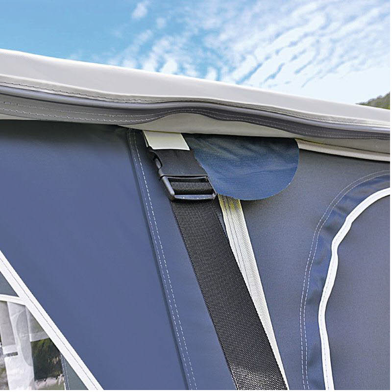 Das Sturmgurt-Set ist speziell für unsere Vorzelte Garmisch und Allgäu, die mit den entsprechenden Laschen versehen sind (links/rechts an der Vorderwand und an den Seitenwänden vorn).