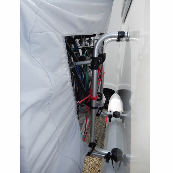 Eine dreidimensional geformte Hülle, die von der Rückfront zum Fahrzeug hin gerichtet aufgezogen wird und somit auch die Unterseite des Fahrradträgers schützt. Ein größerer Bereich an der Rückseite zum Fahrzeug hin ist ebenfalls geschützt, aber nicht komplett geschlossen. Zumindest der zum Fahrzeug zugewandte Fahrradlenker muss quer gestellt werden.