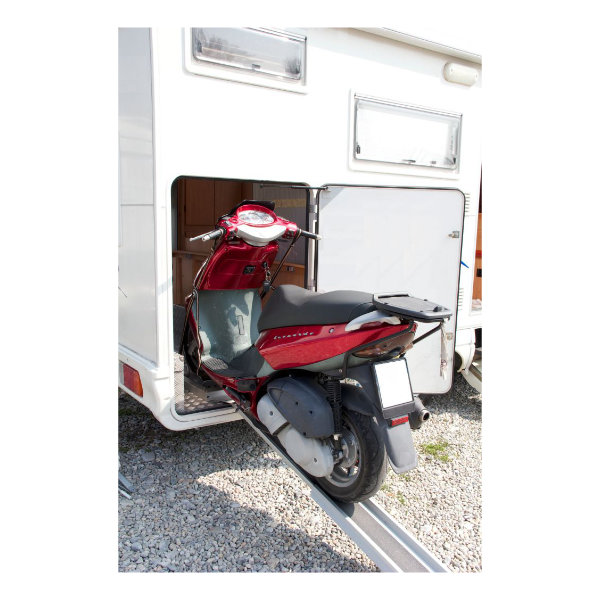 Roller/Motorräder in die Garage zu befördern ist seit jeher eine der schwierigsten Aufgaben de Reisemobilisten zu bewältigen haben. SmartRail löst das Problem auf smarte Weise. Der Halter für Vorderräder von 8 Zoll bis 16 Zoll ist auf einem Schlitten als stabile Aufnahme ausgeführt. Der Schlitten lässt den Roller in die Garage gleiten.