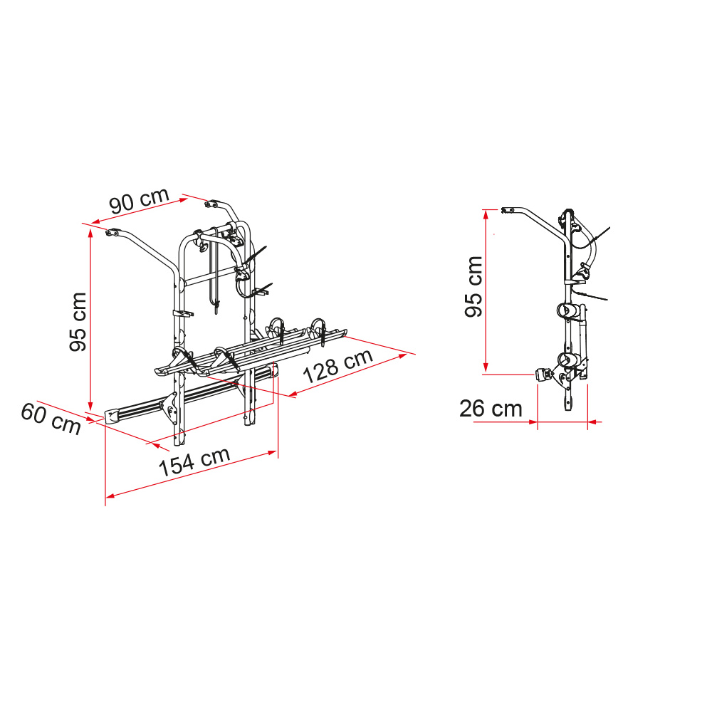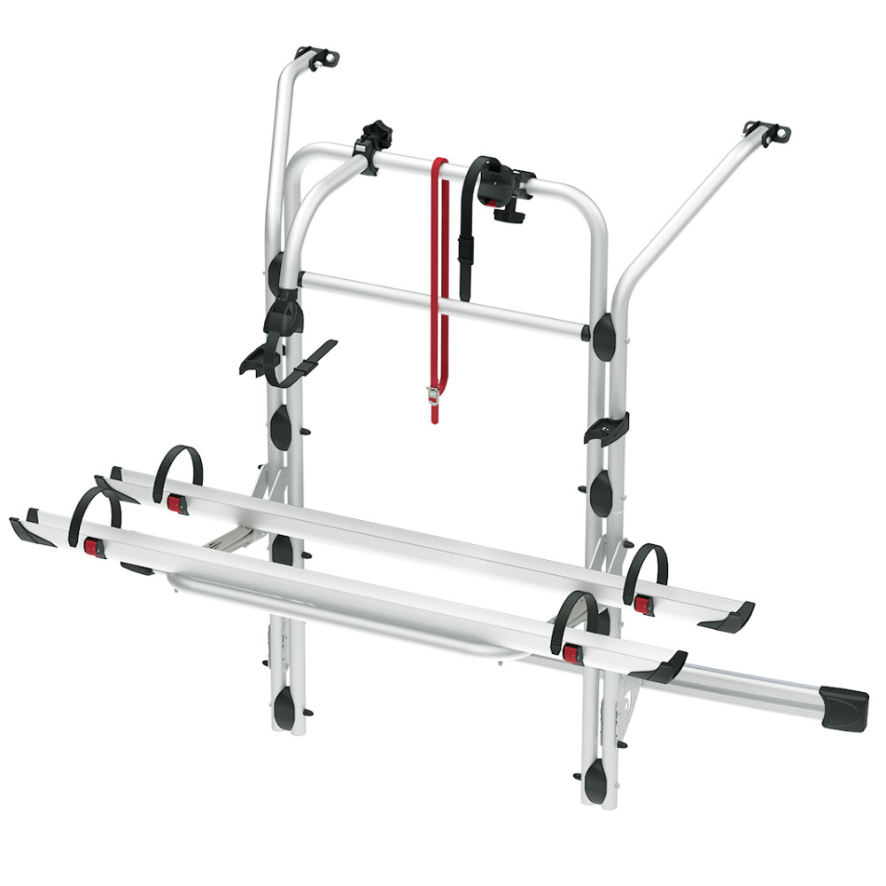 Zur Anbringung an Campingbusse. Die Halterungen zur Anbringung sind im Lieferumfang enthalten und ermöglichen ein sicheres Befestigen an den Hecktüren. Ab Modelljahr 2015 serienmäßig mit zwei Schienen ausgestattet. Der Auflagebügel lässt sich auf 2 Höhen positionieren. In der Tiefladeposition ist eine separate Nummernschildleuchte erforderlich.