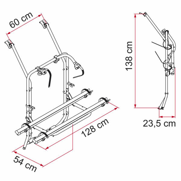 Der Fahrradträger wird an die Hecktür mit speziellen, serienmäßig mitgelieferten Halterungen montiert. Serienmäßig mit 2 Schienen, einfache Positionierung der Räder durch horizontales Verschieben.