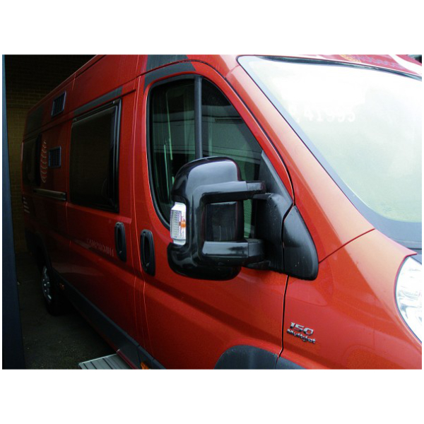 Spiegelprotektorsatz zur einfachen Montage am linken und rechten Außenspielgel bei teilentegrierten Reisemobilen und Alkovenfahrzeugen auf Basis Fiat Ducato X250. Die Protektoren schützen die Spiegel vor Beschädigung durch Kontakt mit Gegenverkehr, Ästen oder Verkehrsschildern. Einfache und sichere Montage durch perfekte Passform und verschraubtem Halter. Keine Bohrungen oder Verschraubungen im Originalspielgel notwendig. Passend für Kurzarm-Originalspiegel.