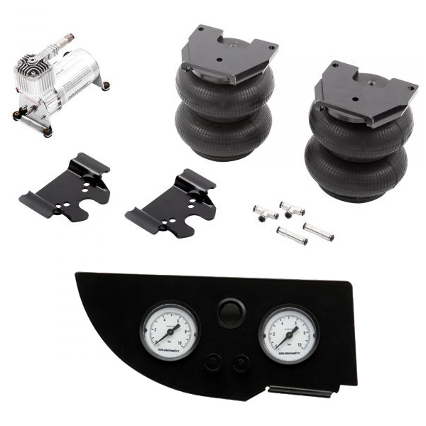 Doppelfaltenbalg-Anlage inklusive 12-Volt-Kompressor zur Montage an der Fahrzeug-Hinterachse; dieses Produkt aus dem Hause Goldschmitt setzt Maßstäbe in puncto Fahrkomfort und Betriebssicherheit. Diese Luftfederanlage ist als sogenanntes „Niederdrucksystem“ konzipiert. Dies bedeutet, dass die Wirkung der Luftfeder nicht durch einen hohen Betriebsdruck in kleinvolumigen Bälgen erzielt wird, sondern durch einen geringen in möglichst großen Bälgen.
