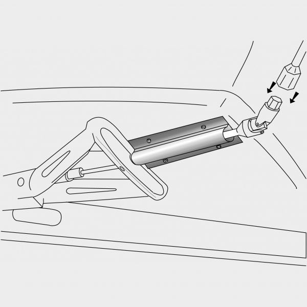 ANBAU - Der Anbaubereich für das Kunststoffprofil am Boden muss frei sein, d. h. ohne Leitungen und sonstige Bauteile. Bei Fahrzeugen mit Außenschürze ist eine Bohrung in der Schürze vorzusehen. Die 4 Kunststoffprofile werden nach Bedarf auf Länge gesägt und anschließend mit Holzschrauben am Boden als Kurbelführung befestigt.
