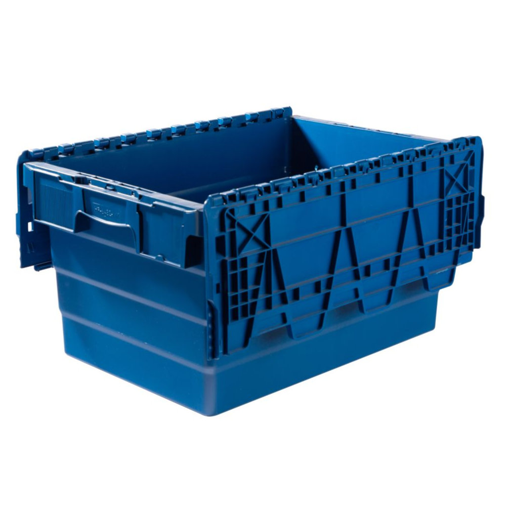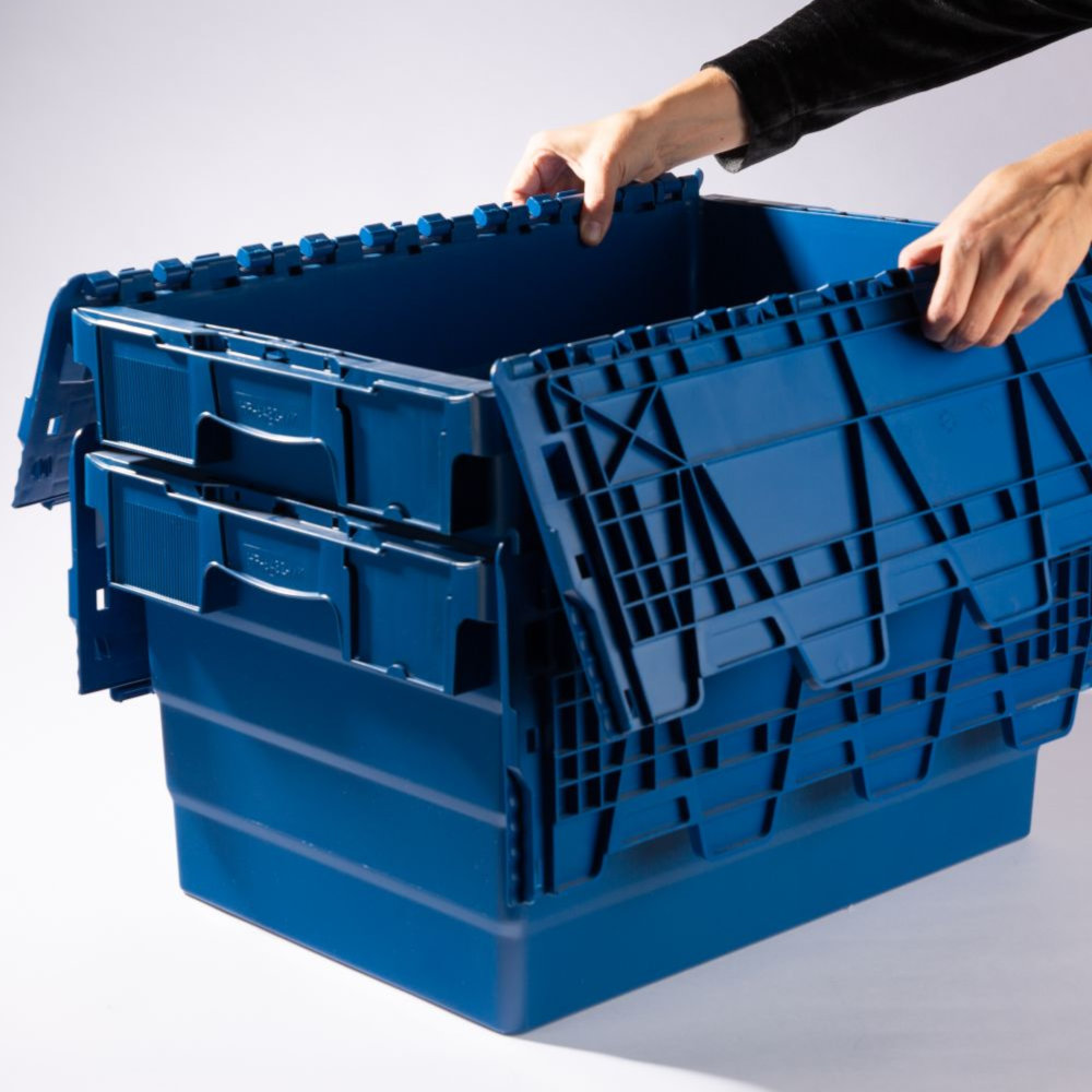 Stapelbare, nestbare Kunststoffbox mit 21/32/60 Liter Fassungsvermögen sowie einer Tragfähigkeit bis 35 kg. Der zweiteilige Klappdeckel ermöglicht leichtes Be- und Entladen. Seitenwände und Boden der Transportbox sind vollständig geschlossen. Die stabile Kunststoffbox ist mit geschlossenem Deckel bequem stapelbar.