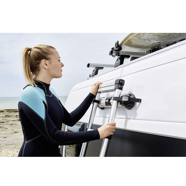 Einfache Befestigung auf allen magnetischen Flächen. Nutzen Sie die Magnetbefestigung für eine stabile Fixierung der Teleskopleiter. Befestigungsmöglichkeiten für Thule Windscreen und Thule Organizer. Lieferung incl. Packtasche.