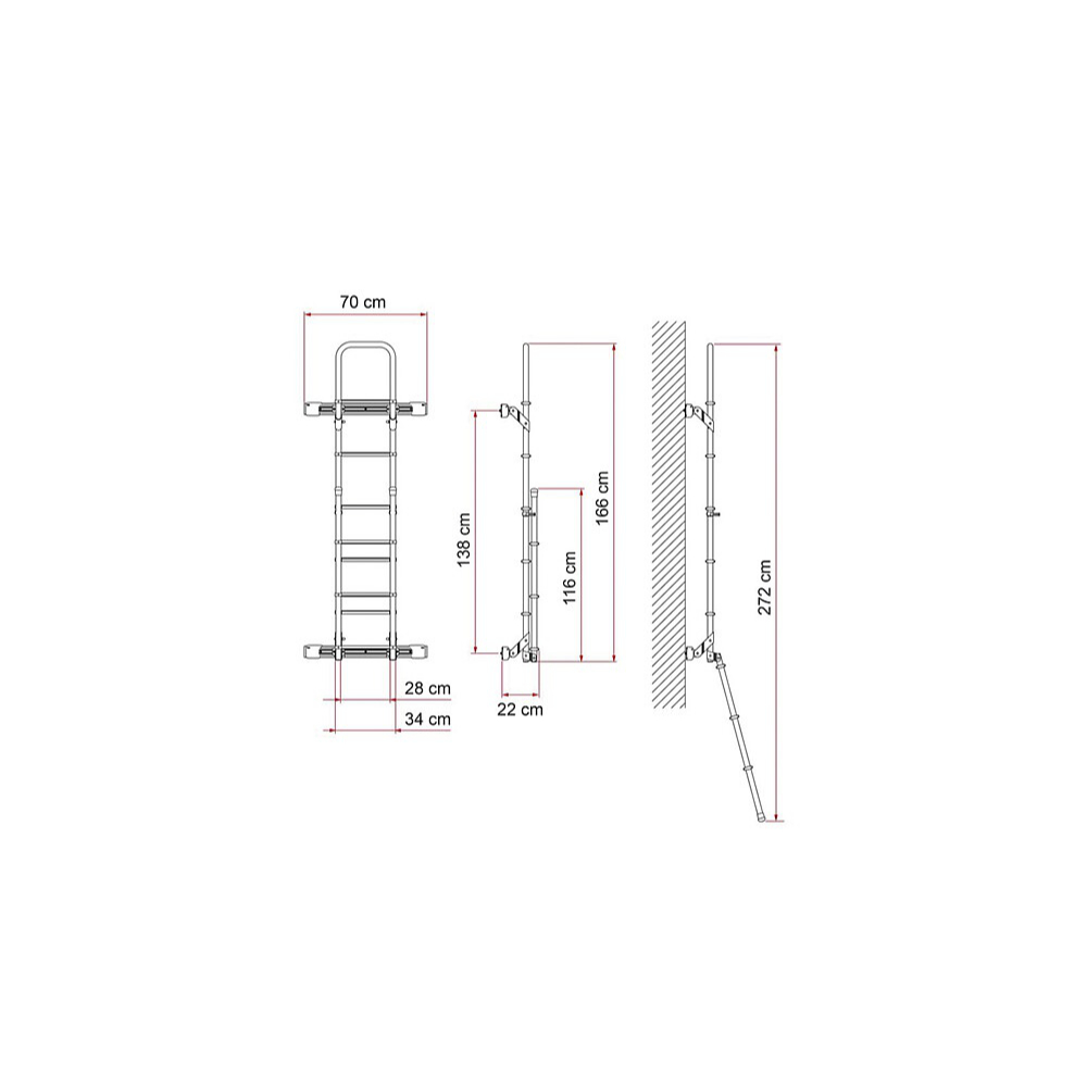 Die stabile und leicht nach unten klappbare Alu-Leiter wird an die linke Flügeltür montiert. Die Trägerrohre haben einen Durchmesser von 30 mm und eine Stärke von 2 mm.