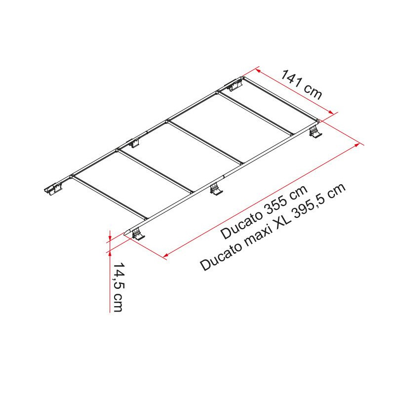 Dachträgersystem speziell für den Ducato ab Bj. 2006, sowohl für den langen wie auch den kurzen Radstand (bei Bedarf kann das Profil gekürzt werden). Montage erfolgt ohne Bohrung, da das Profil auf die Originalpunkte des Fiat Ducato installiert wird. Dank den mitgelieferten Adaptern kann die Dachmarkise F65 S auf der rechten Seite angebracht werden.