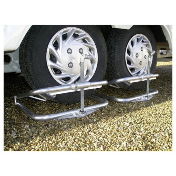 Der Leveller wird einfach unter den Reifen geschoben. Das Fahrzeug kann dann mit Hilfe der Ratsche einfach und schnell angehoben oder abgesenkt und somit optimal in Waage gehalten werden. Für Räder von 13 bis 16 Zoll.