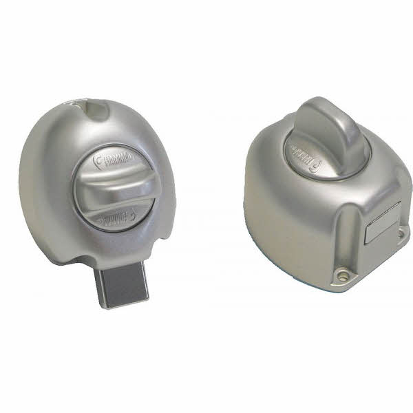 Sicherheitsblock zur Anbringung im Inneren der Tür oder Garage von Wohnmobilen und Wohnwagen, zum Blockieren der Vordertür des Wohnmobiles. Aus robustem Druckgussaluminium hergestellt. Ohne Plastikteile. Wird anstelle der serienmäßig schwachen Kunststoffschlösser angebracht. Die vorhandenen Bohrungen können benutzt werden.