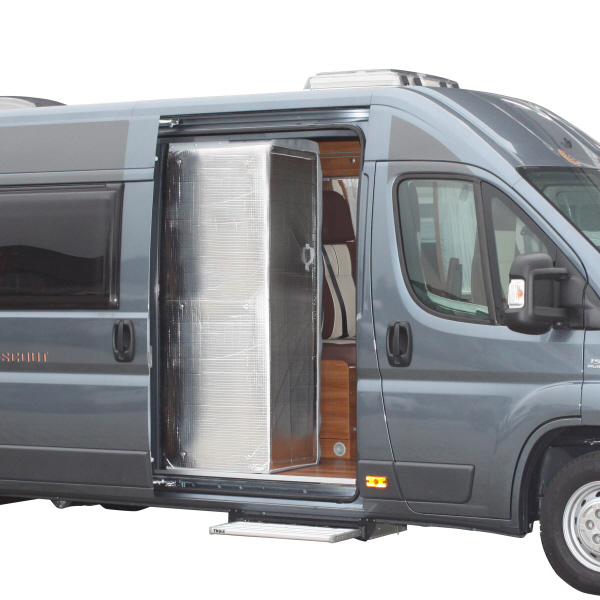 Speziell für den hohen Hecktür-Ausschnitt H2 des Fiat Ducato ab Baujahr 07/2006 entwickelte, zweiteilige Isolierung mit innenseitiger Veloursbeschichtung. Zum Schutz vor Zugluft wird sie mittels Magneten auf der Innenseite der Flügeltüren angebracht. Bei geschlossenen Türen überlappen sich die beiden Teile in der Mitte und bilden so eine effiziente Wärmeisolierung im Schlafbereich.