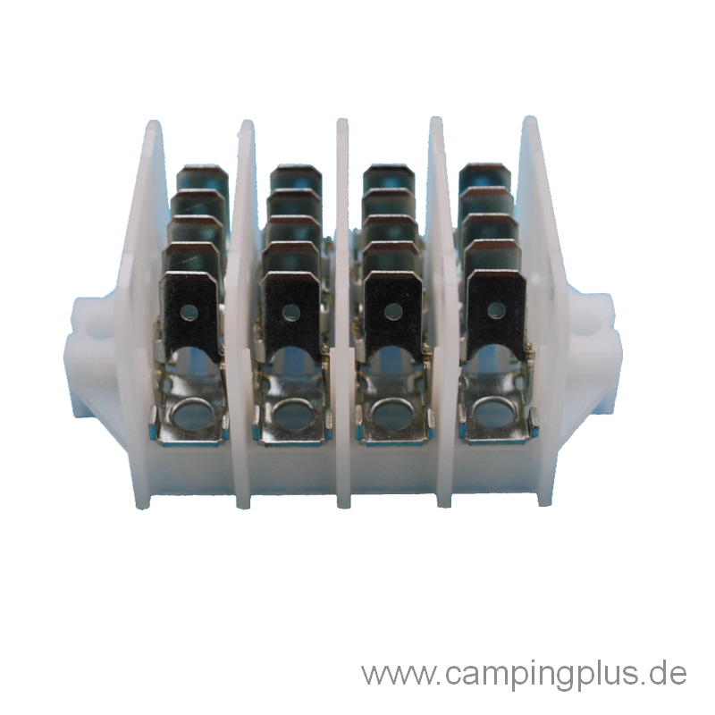 4-fach Verteilerleiste zur Vereinfachung der Stromverkabelung im Caravan und Reisemobil mit je 5 Flachkontakten 6,3 x 0,8 mm in jedem Fach.