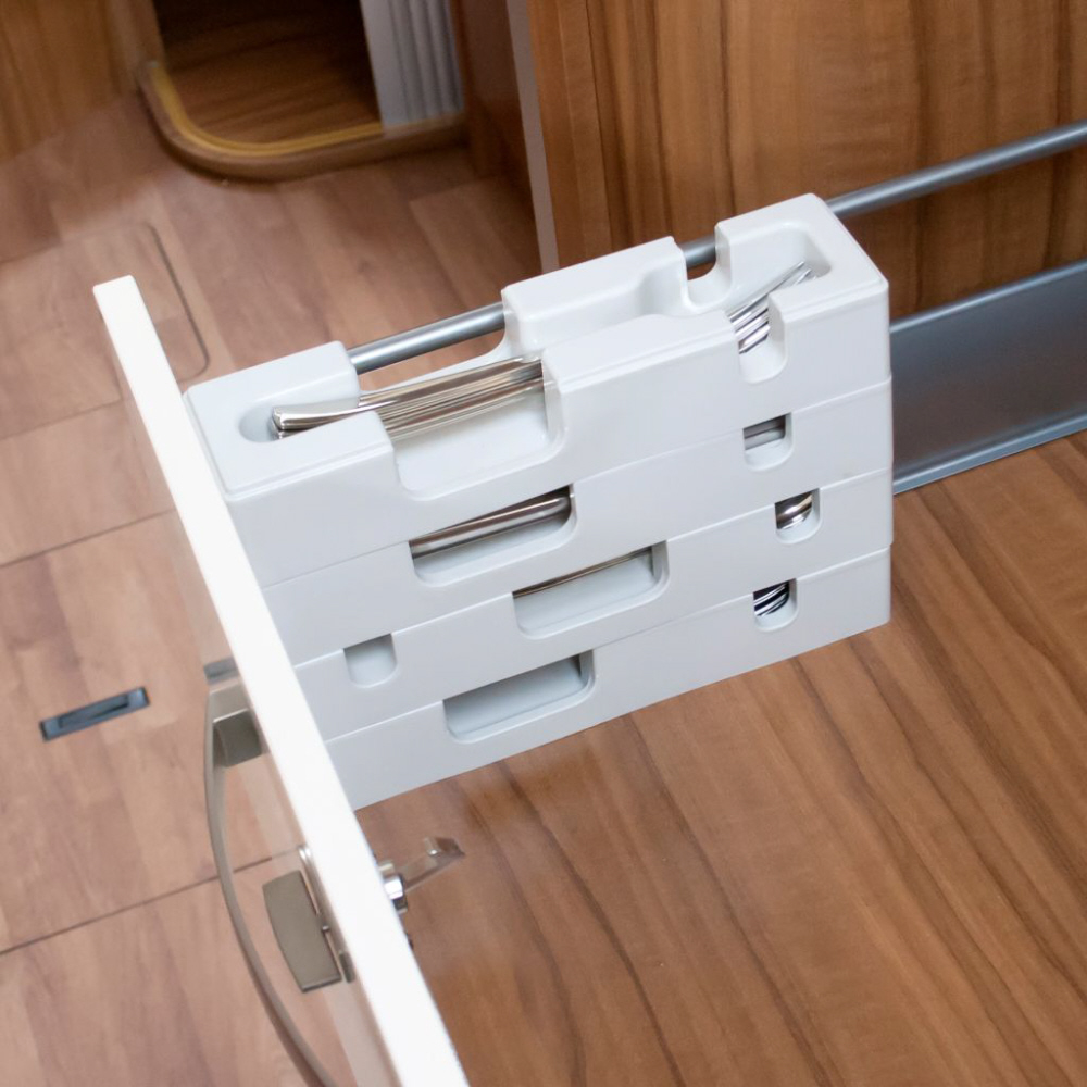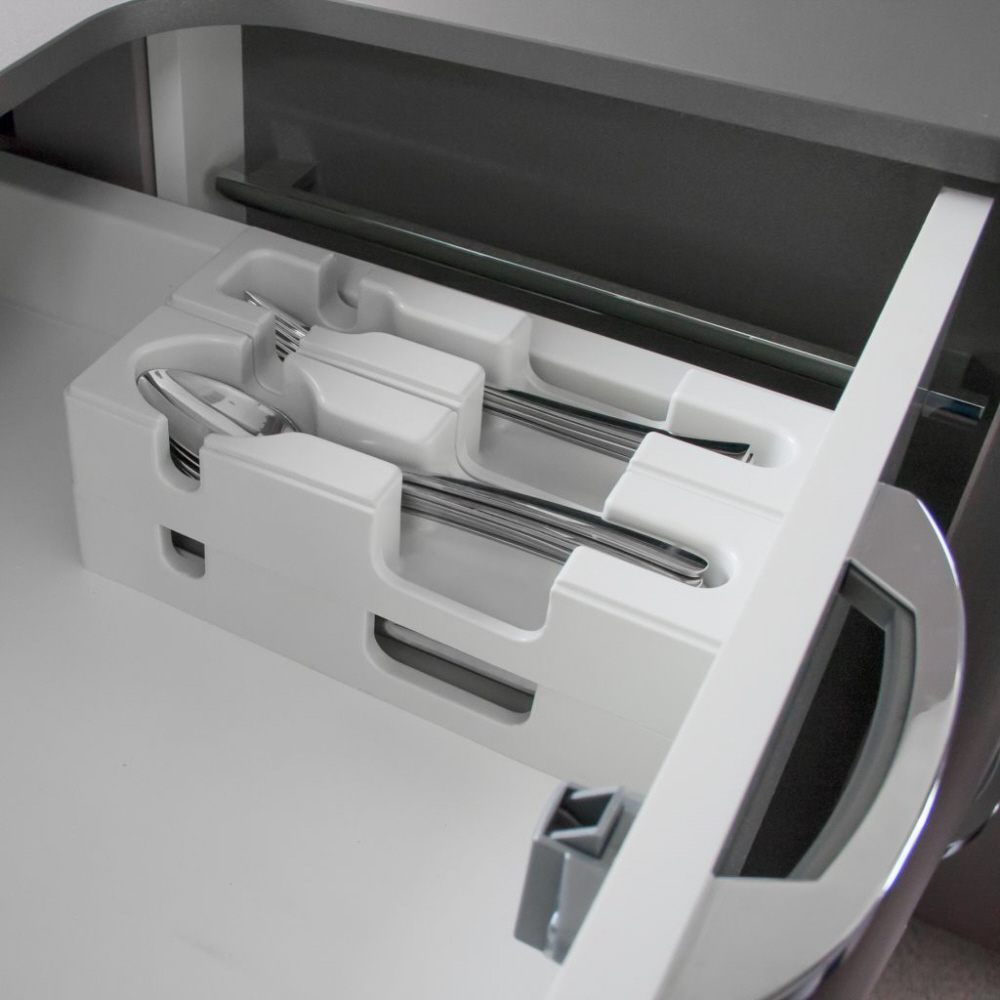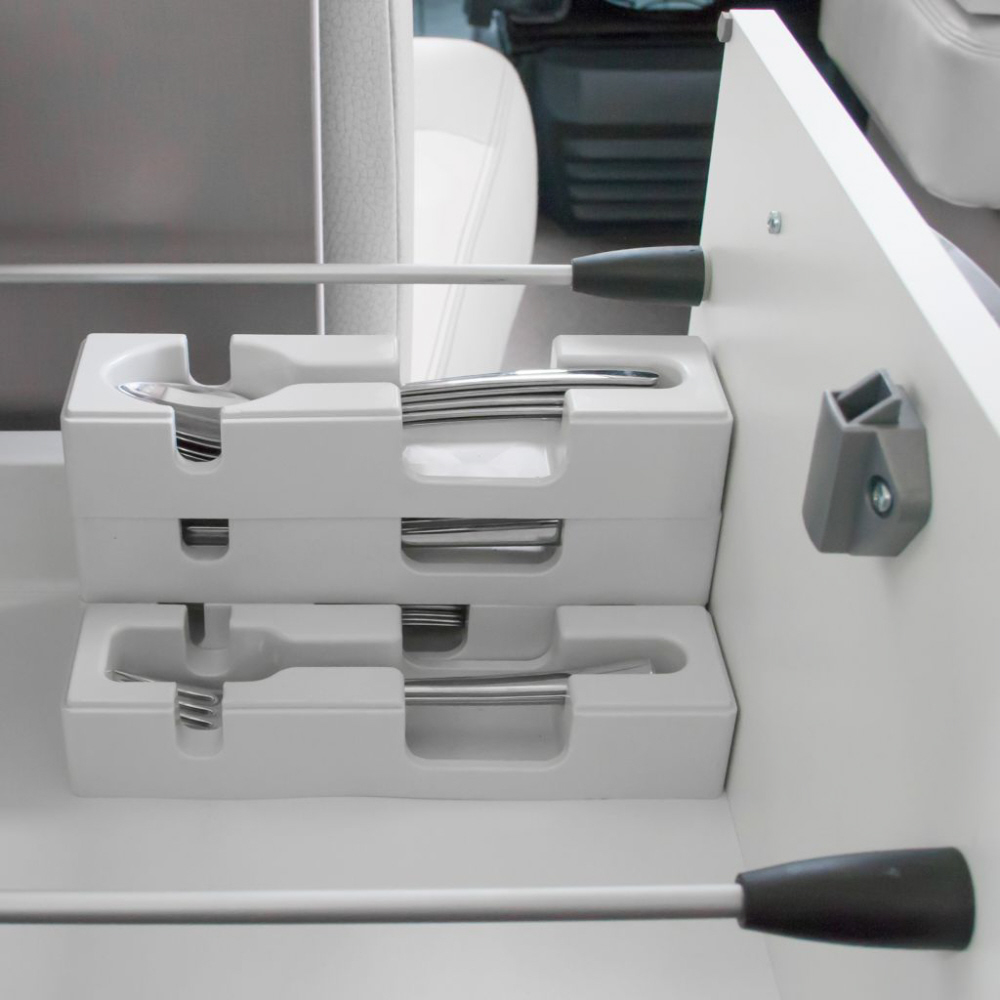 Stapelbare Besteckeinsätze, konturgenaue Führung des Bestecks und somit geräuscharm bei der Fahrt, modulare Verwendung, formstabil. Durch das praktische Stapeln ergibt sich eine noch bessere Nutzbarkeit für schmale od. kleine Schubfächer – besonders geeignet für kleine Fahrzeuge.