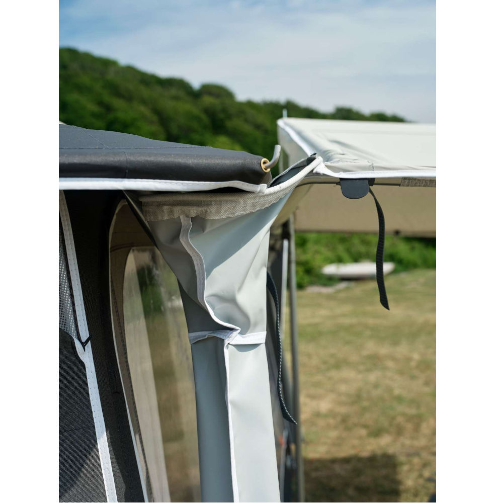 Das Design ist perfekt auf das Penta Vorzelt abgestimmt, da für Sonnendach und Vorzelt das gleiche Dachmaterial verwendet wird. Als zusätzlicher Windschutz ist eine rechte und eine linke Seite optional erhältlich. Die Seitenteile folgen unserem Etna-Farbthema und passen deshalb perfekt zum Penta Etna, harmonieren jedoch auch ausgezeichnet mit den Farbkombinationen älterer Penta-Modelle.