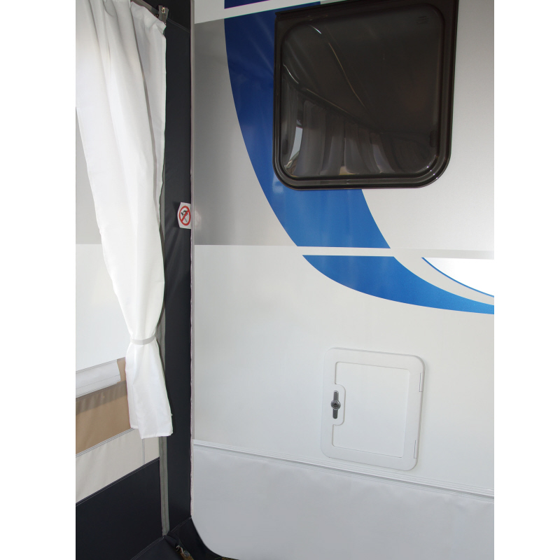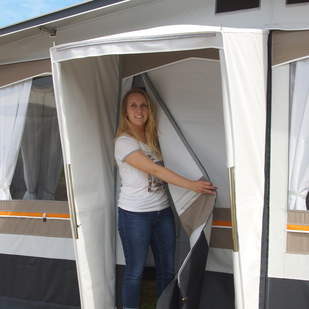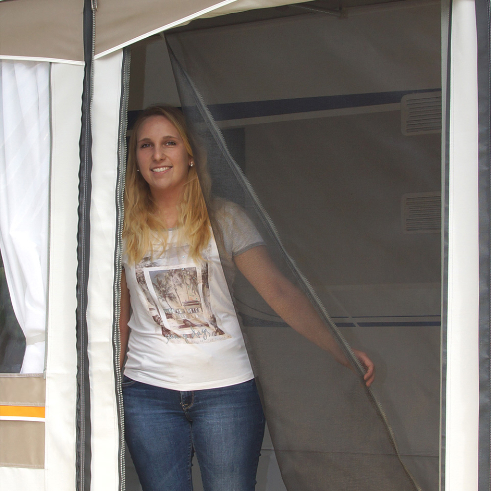 Lieferumfang: Vorzelt, Gestänge, Schürze und Radkastenabdeckung aus Planenstoff, Gardinen, Abspannmaterial, Packsäcke und Deichselhaube.