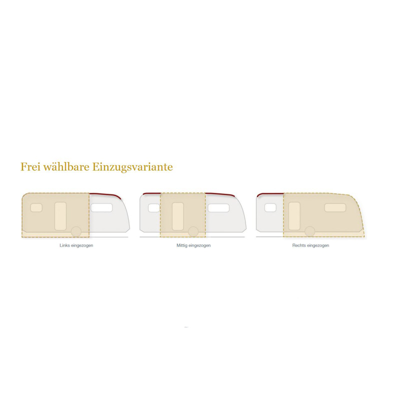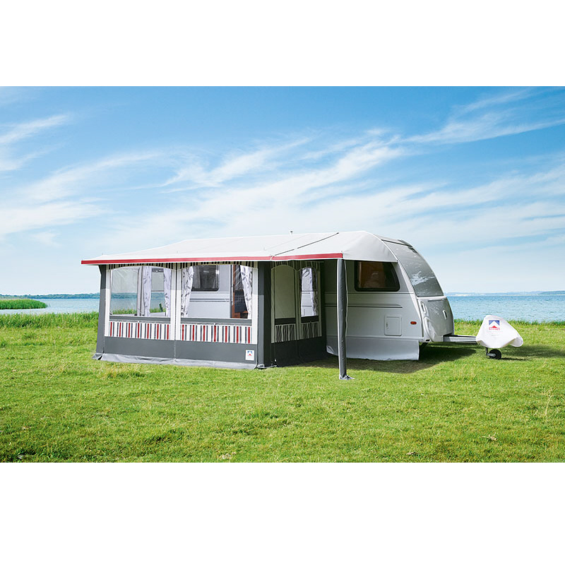 Lieferumfang: Vorzelt, Gestänge, Schürze und Radkastenabdeckung aus Planenstoff, Gardinen, Abspannmaterial, Packsäcke und Deichselhaube.