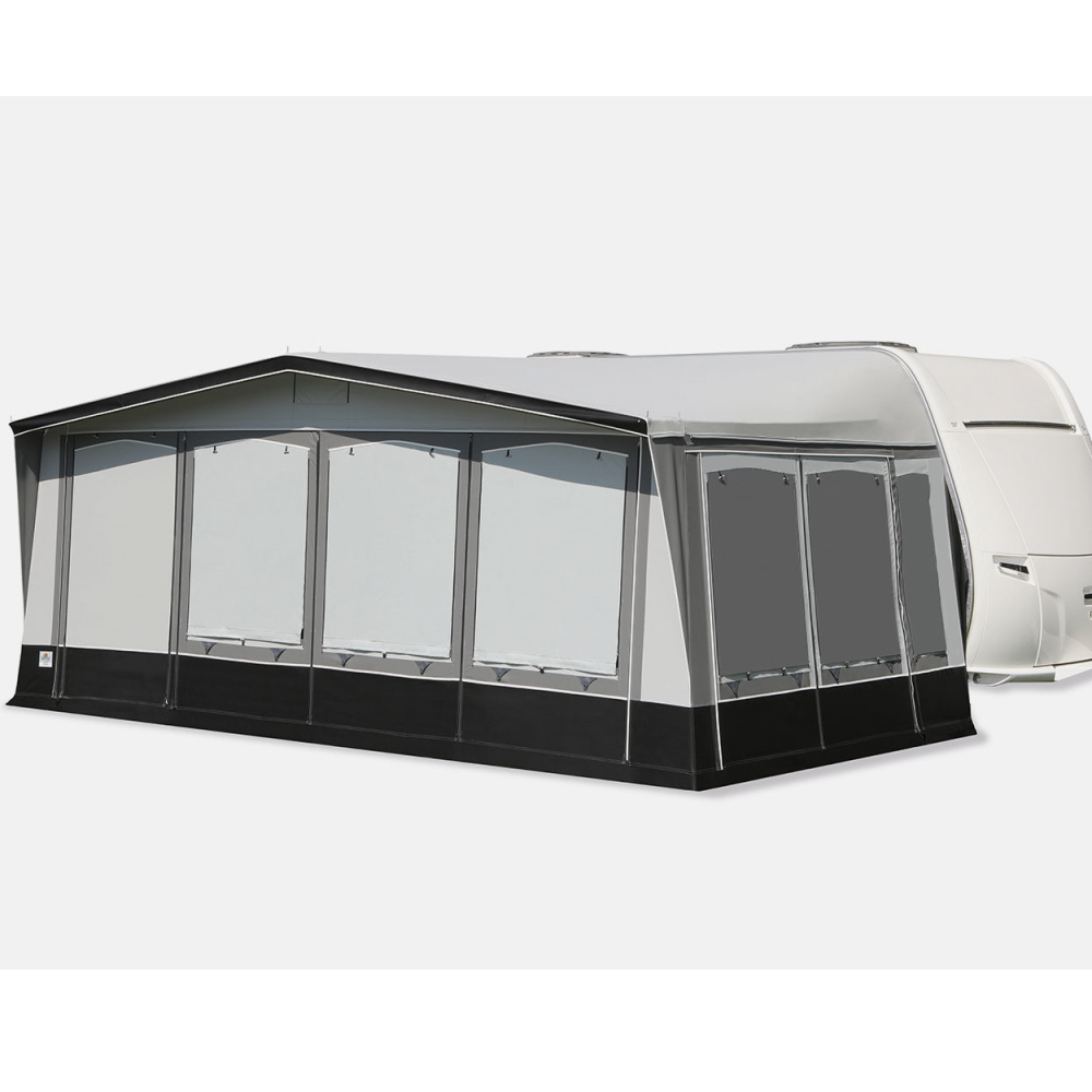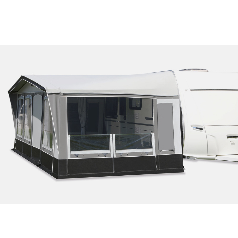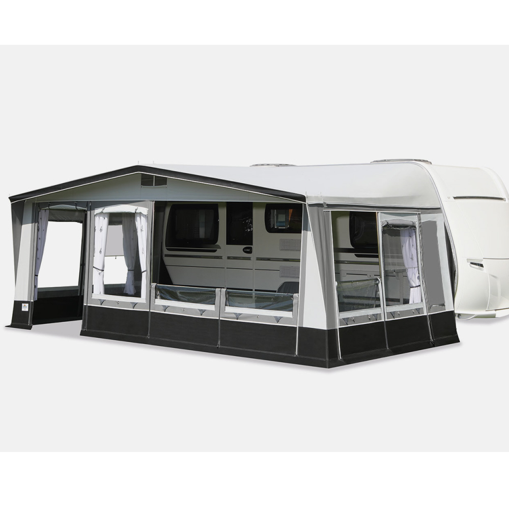 Bei diesem Saison- und Ganzjahres-Vorzeltmodell kommt für das Dach und die Seitenwände ein robustes PVC-Material zum Einsatz. Die Vorderwand wird aus atmungsaktivem „Ten Cate“-Gewebe gefertigt. Frei wählbare Eingangspositionen durch die Elementtechnik der Vorderwand. Für die Seitenwände gibt es insgesamt vier Fensterelemente: zwei Folienfenster und zwei Lüftungsfenster. Diese vier Elemente können nach Wunsch positioniert werden. Auch ein Türelement (lieferbar gegen Mehrpreis) kann in den Seitenwänden variabel eingesetzt werden. Fensterklappen, Wetterschutzabdeckung der Reißverschlüsse, eine verschließbare Hochentlüftung und ein 28 x 1 mm Stahlrohrgestänge mit PowerGrip und Vordachverstärkung komplettieren die umfangreiche Serienausstattung.