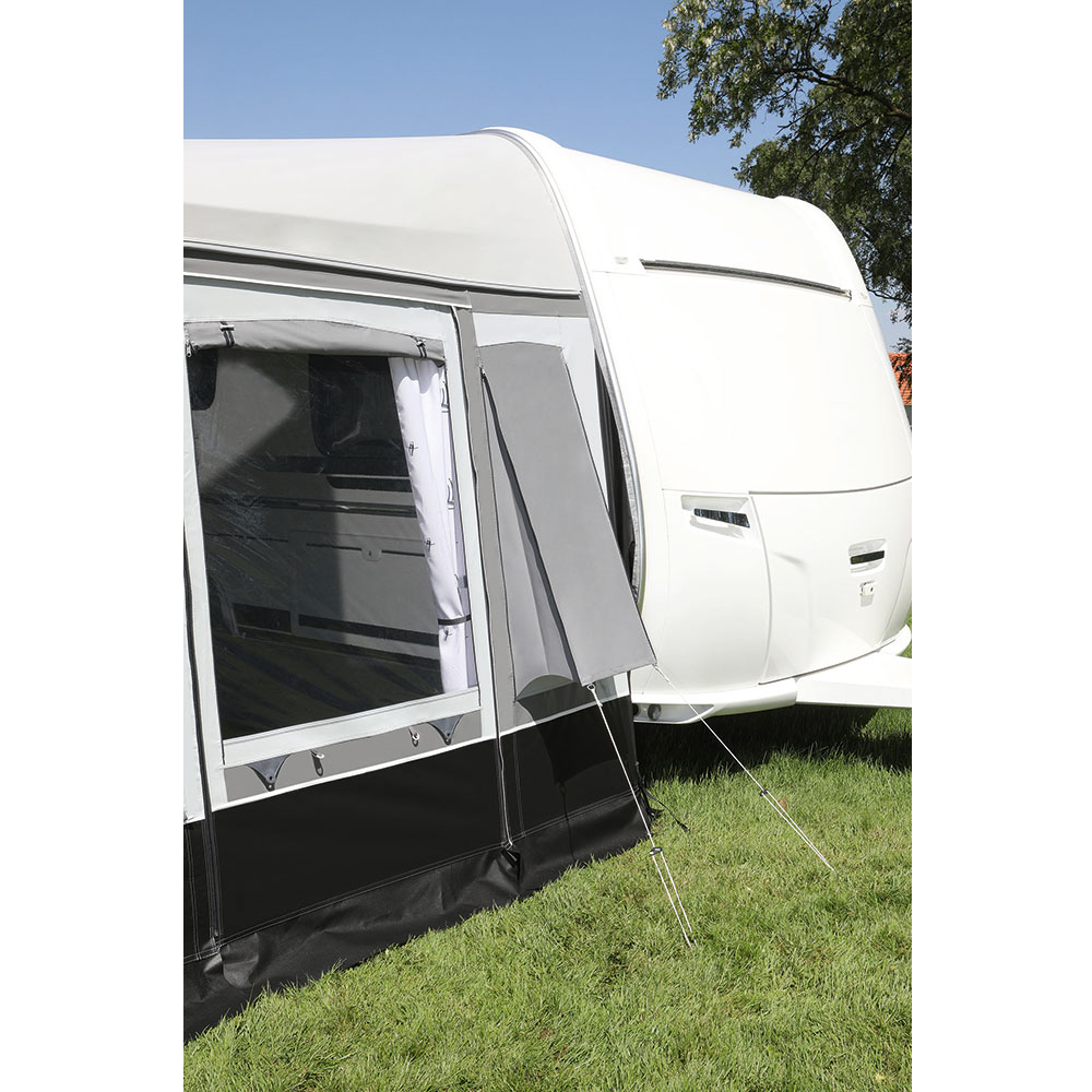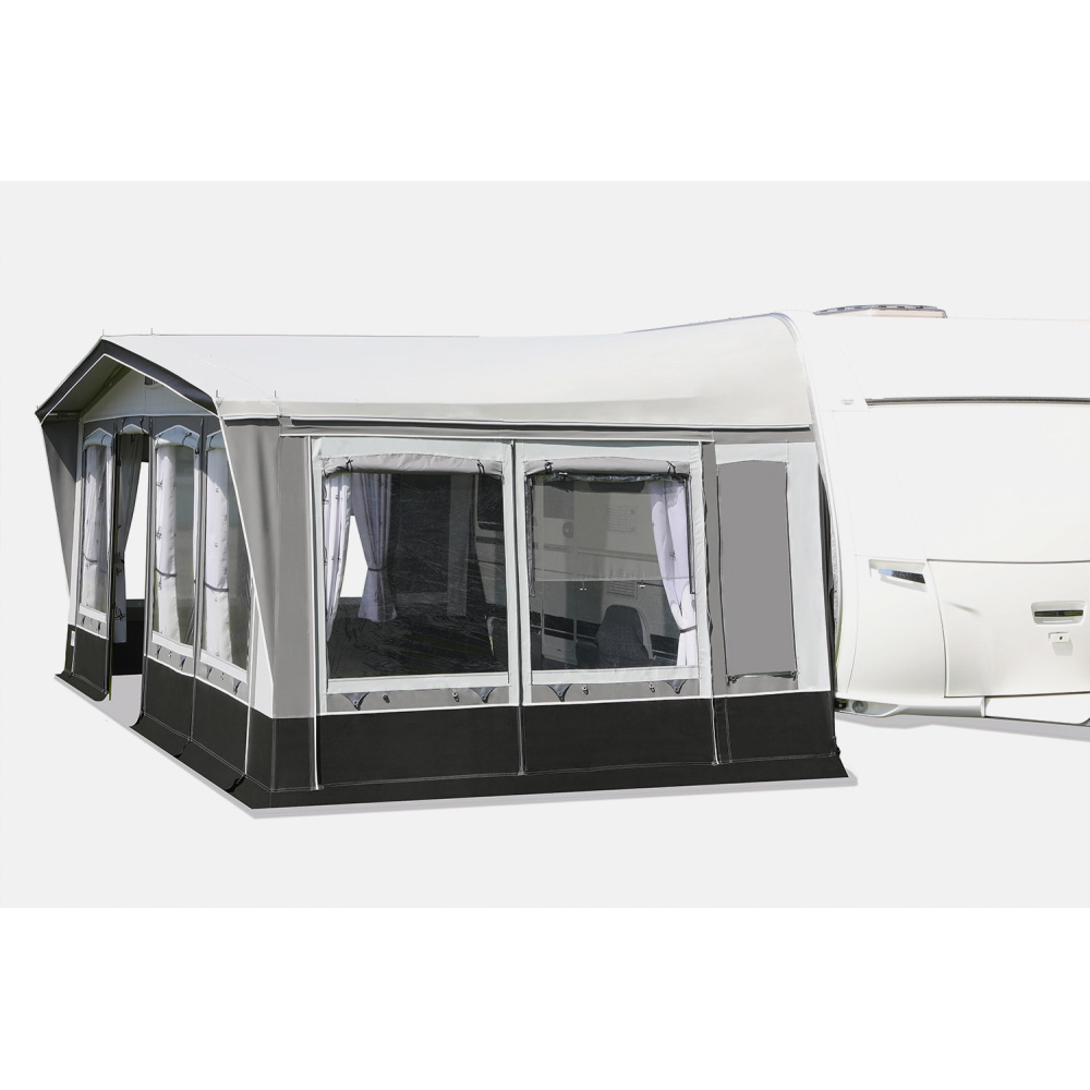Bei diesem Saison- und Ganzjahres-Vorzeltmodell kommt für das Dach und die Seitenwände ein robustes PVC-Material zum Einsatz. Die Vorderwand wird aus atmungsaktivem „Ten Cate“-Gewebe gefertigt. Frei wählbare Eingangspositionen durch die Elementtechnik der Vorderwand. Für die Seitenwände gibt es insgesamt vier Fensterelemente: zwei Folienfenster und zwei Lüftungsfenster. Diese vier Elemente können nach Wunsch positioniert werden. Auch ein Türelement (lieferbar gegen Mehrpreis) kann in den Seitenwänden variabel eingesetzt werden. Fensterklappen, Wetterschutzabdeckung der Reißverschlüsse, eine verschließbare Hochentlüftung und ein 28 x 1 mm Stahlrohrgestänge mit PowerGrip und Vordachverstärkung komplettieren die umfangreiche Serienausstattung.