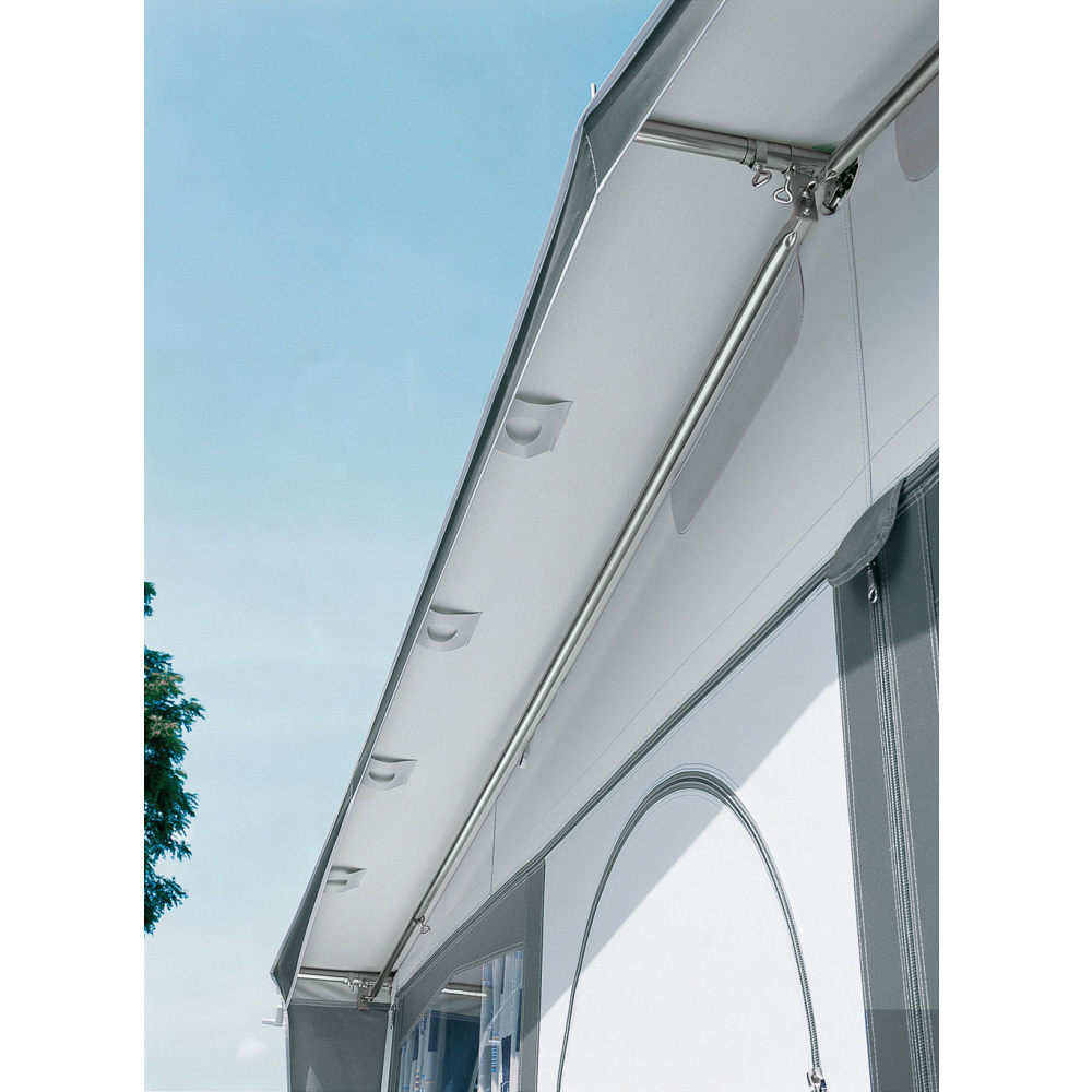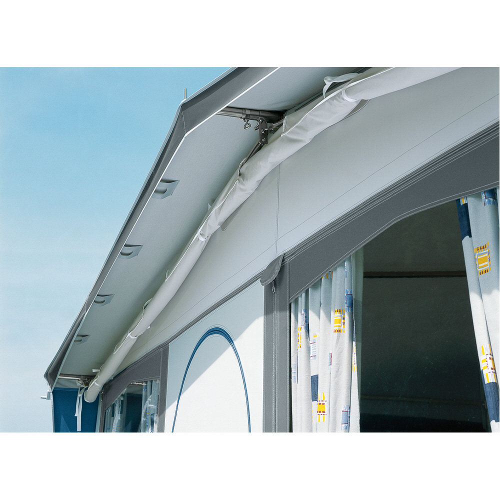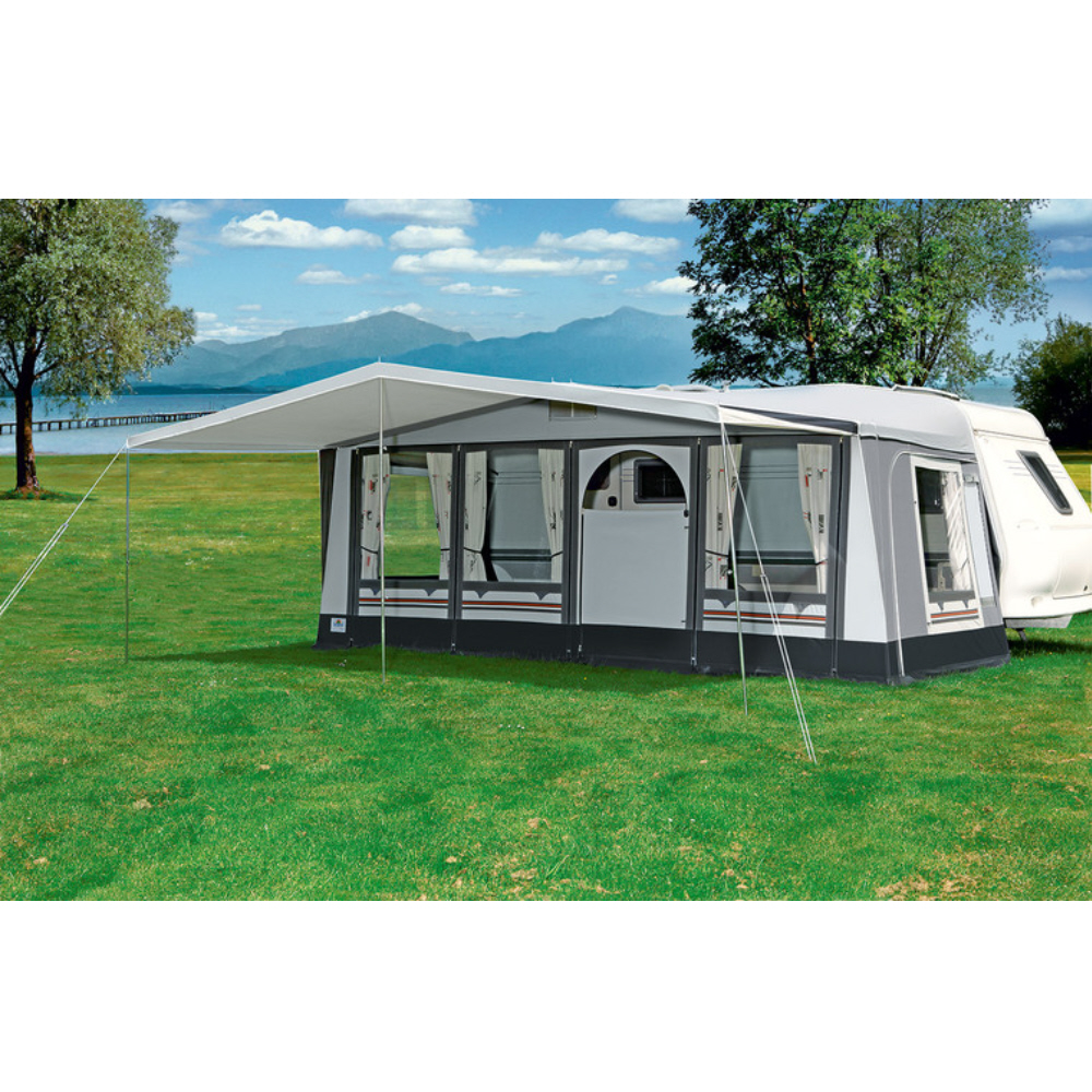- Spezialadapter und Giebelstangen sorgen für eine optimale Passform, geben den notwendigen Halt auch zum Vorzelt. Vorzelt und Sonnendach bilden eine kompakte Einheit.