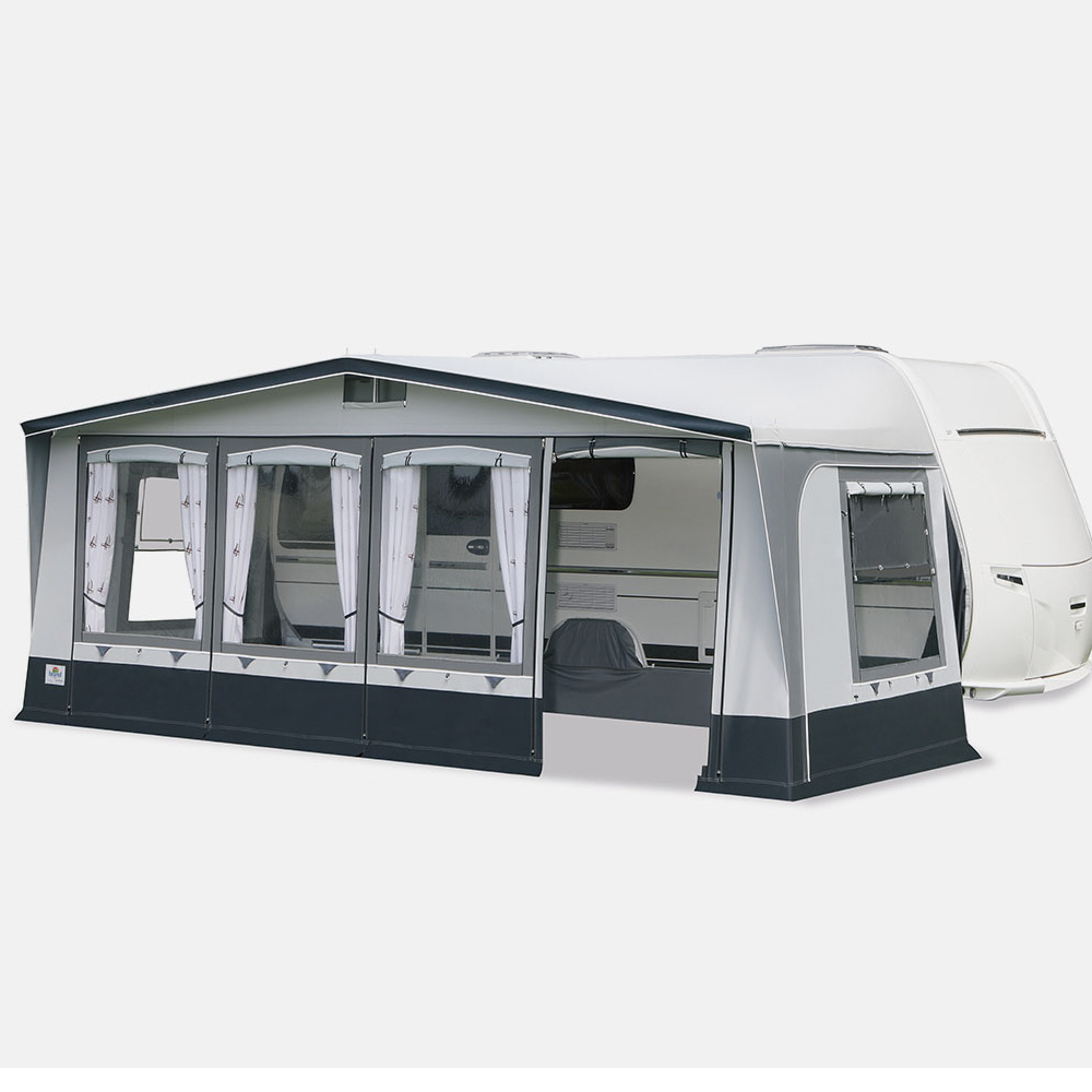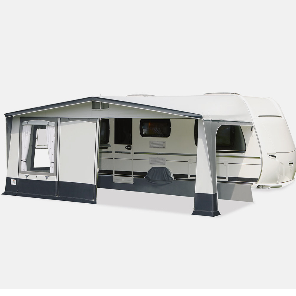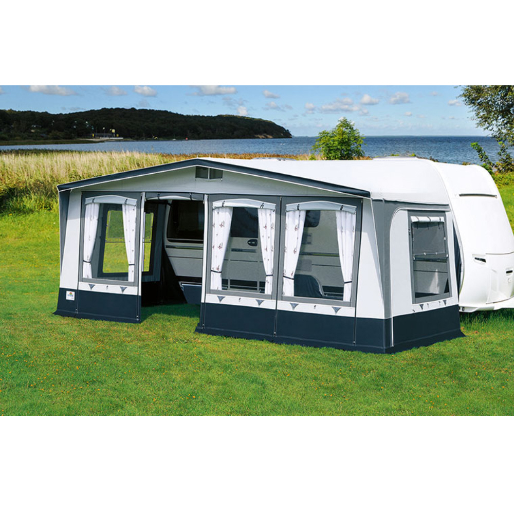 Das Vorzeltmodell TARIFA ist das preisgünstigste Angebot für den Saisoneinsatz und oder das Ganzjahrescamping. Wir verwenden für das Dach und die Seitenwände ein robustes PVC-Material, die Vorderwand wird aus atmungsaktivem TenCate - Gewebe gefertigt. Alle Vorderwand-Elemente sind gegeneinander tauschbar (Element-Technik). Dies ermöglicht eine frei wählbare Türposition in der Vorderwand individuell nach den Erfordernissen des Stellplatzes. Alle Fenster mit Fensterklappen. Die Lüftungsgaze der Seitenfenster ist mit zusätzlicher Regenschutzfolie ausgestattet.