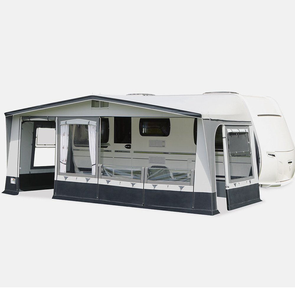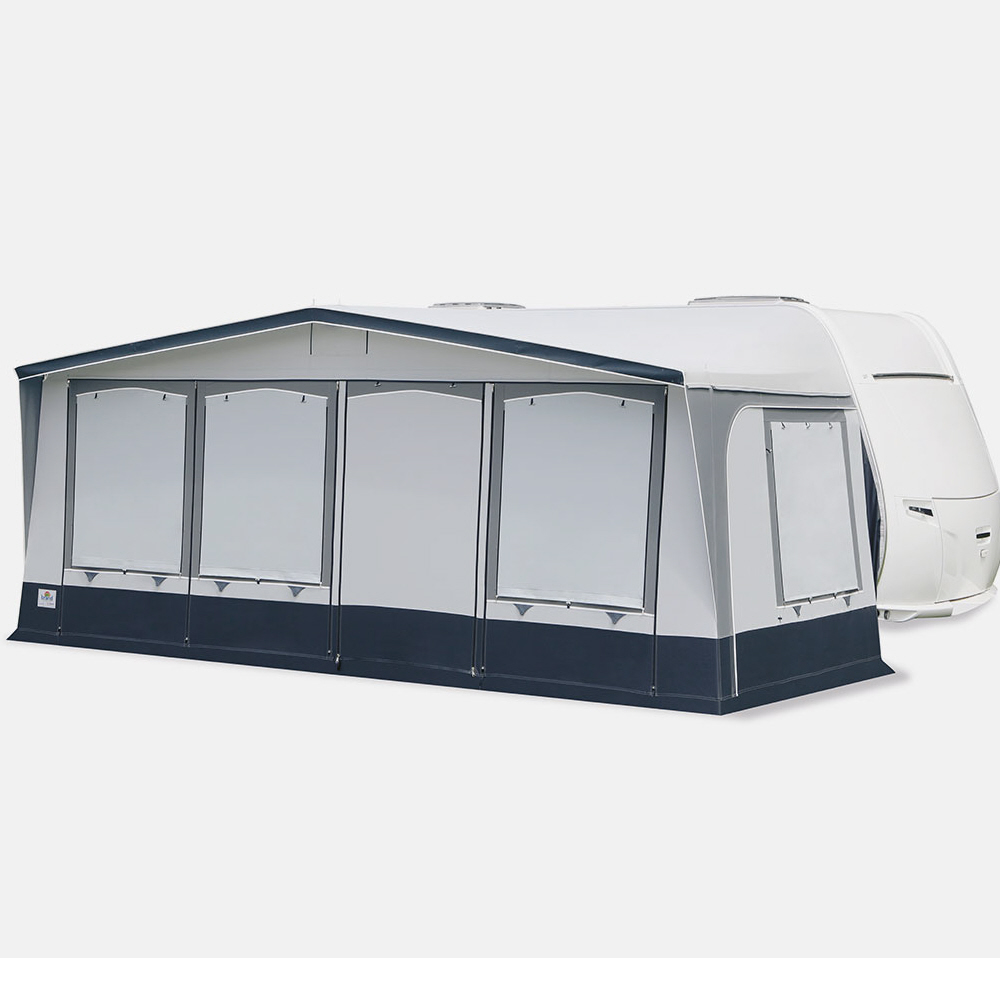 Das Vorzeltmodell TARIFA ist das preisgünstigste Angebot für den Saisoneinsatz und oder das Ganzjahrescamping. Wir verwenden für das Dach und die Seitenwände ein robustes PVC-Material, die Vorderwand wird aus atmungsaktivem TenCate - Gewebe gefertigt. Alle Vorderwand-Elemente sind gegeneinander tauschbar (Element-Technik). Dies ermöglicht eine frei wählbare Türposition in der Vorderwand individuell nach den Erfordernissen des Stellplatzes. Alle Fenster mit Fensterklappen. Die Lüftungsgaze der Seitenfenster ist mit zusätzlicher Regenschutzfolie ausgestattet.