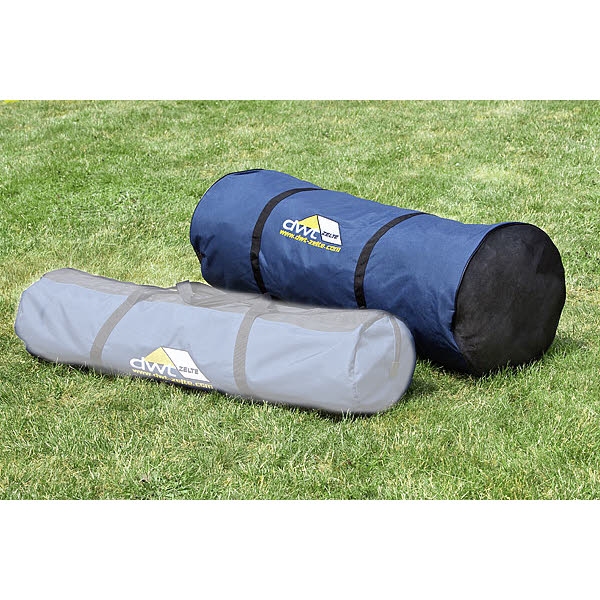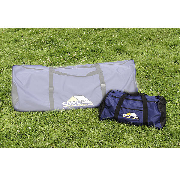 Lieferumfang: Zelthaut, Gestänge, Gardinen, Abspannmaterial, Rad- und Windblende, 1 Packsack, 1 Gestängepacksack und Vordachgestänge.