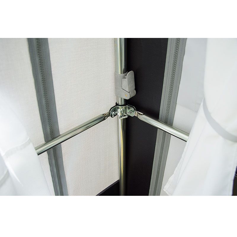 Gestänge: 28 x 1 mm Stahl inkl. Vordachspannstäben und Distanzstücken, ab Größe 11 mit zwei zusätzlichen Dachstangen, ab Größe 13 mit zwei zusätzlichen Orkanstützen, ab Größe 18 mit 4 zusätzlichen Firststangen.