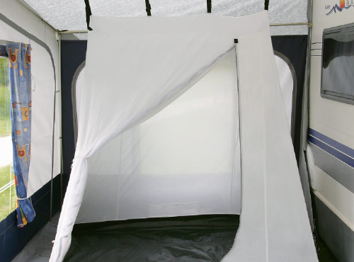 Vorderwand: teilbar und herausnehmbar; hochrollbare Tür links der Mitte; Fenster mit Gardinen ausgestattet; waagerechte Hohlsäume unter den Fenstern zur Aufnahme von Sturmgestänge oder Verandastangen. Ab Größe 16 linkes Vorderwandfenster in 2 Fenster unterteilt.