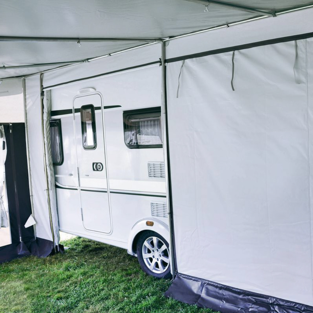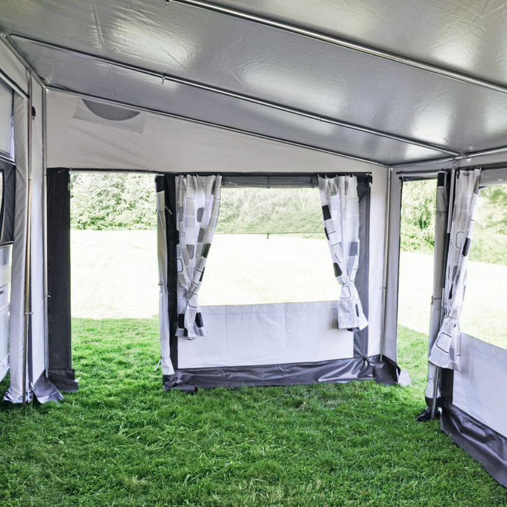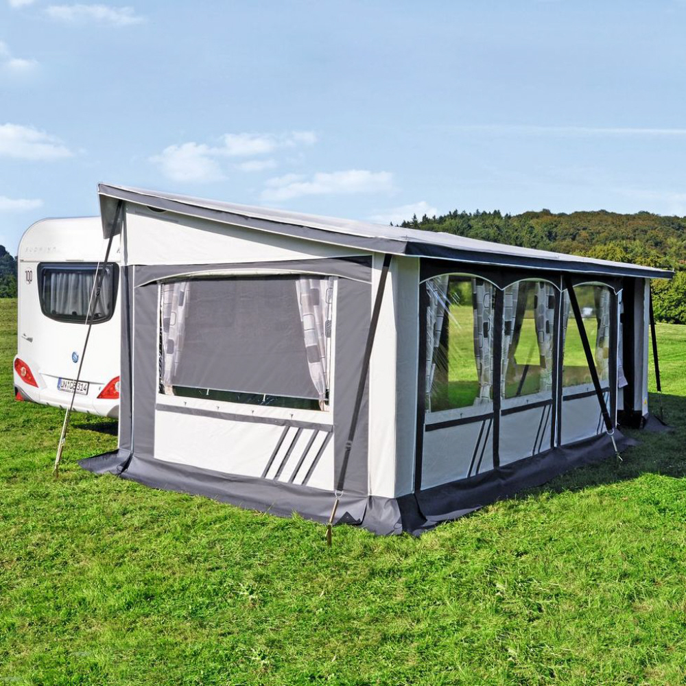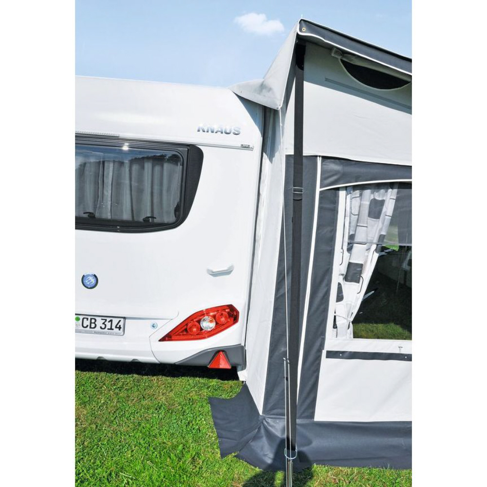 Das freistehende, wetterfeste Vorzelt ist komplett aus PVC. Ein doppelter Erdstreifen mit angenähtem Keder ermöglicht es spezielle Abspannhaken nach Wunsch zu verschieben. Hohlsäume am Vordach und innen unter den Fenstern, sowie Sturmleisten unter allen Fenstern außen, ermöglichen eine zusätzliche Gestänge-Montage (Sturmgestänge). Alle Fensterklappen lassen sich mit einem Reißverschluss verschließen. 3-seitiger Dachüberstand ca. 25 cm und 40 cm breite Überwurflasche, längsseitig zur Fahrzeugwand.