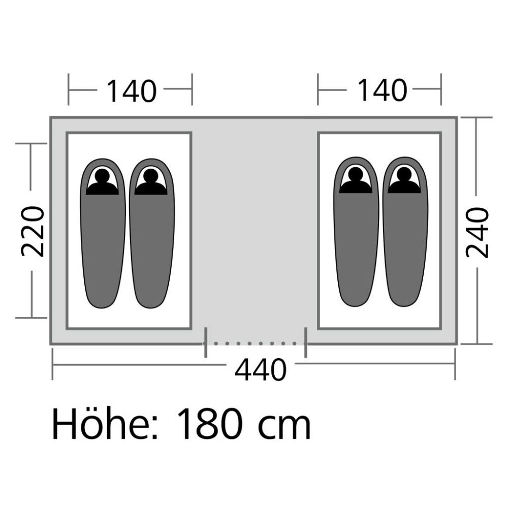 Zelt mit gegenüberliegenden Schlafkabinen. Das Außenzelt wird zuerst aufgebaut und dann das Innenzelt eingehängt. Das hat den Vorteil, dass das Innenzelt bei regnerischen Wetter trocken bleibt. Tagsüber kann das Innenzelt zur Wohnraumvergrößerung ausgehängt werden. Die Eingänge mit der Schlafkabinen mit ganzflächigen Moskitonetztüren bieten optimale Belüftung und Insektenschutz. Organizer, Lampenhalter und Innenzelttaschen runden die Ausstattung ab.