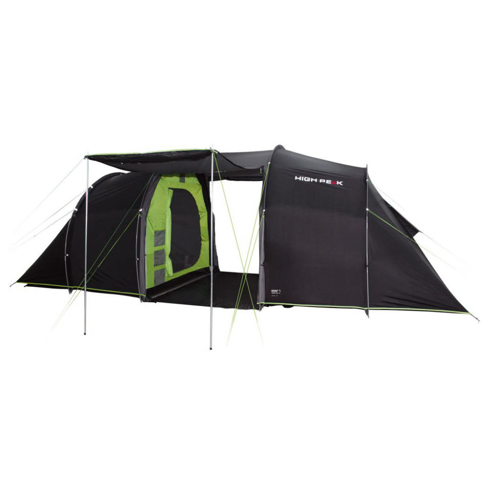 Der Wohnraum hat Lichtquellenfenster und einen pflegeleichten Zeltboden. Der Eingang kann als Sonnendach aufgestellt werden. Die gegenüberliegenden High Peak Vario Ventilationen belüften das Zelt auch bei regnerischem Wetter und sollten immer geöffnet sein. Die Reißverschlussabdeckung ist mit einer zusätzlichen Regenrinne ausgestattet. Das Innenzelt ist abnehmbar und bleibt somit beim Aufbau im Regen trocken.